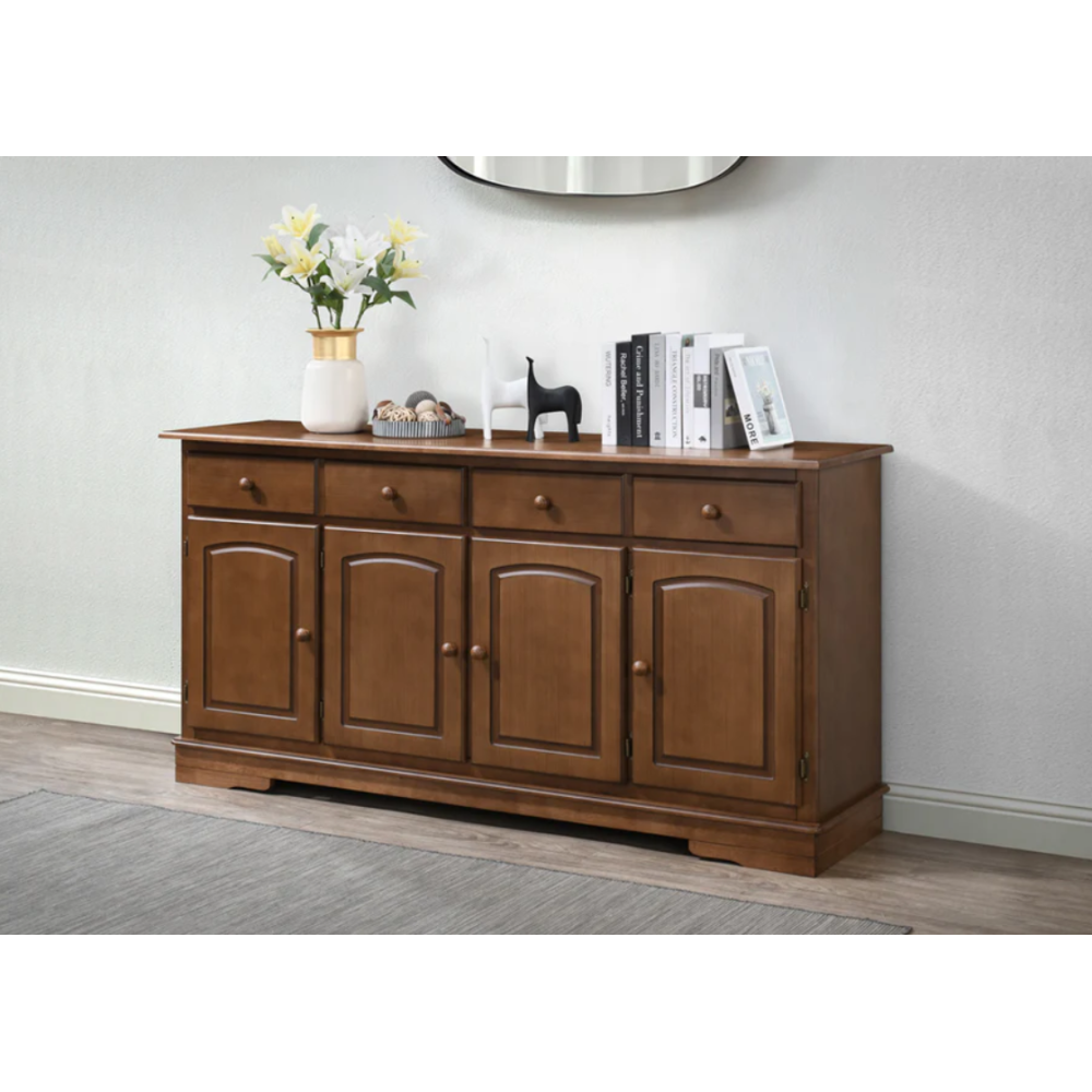 Buffet doté de 4 portes et 4 tiroirs - À poser dans n’importe quelle pièce de la maison pour disposer des outils décoratifs, ranger la vaisselle ou d’autres éléments de la maison - Equipé de petites poignées circulaires faciles à tenir pour ouvrir ou fermer les cavités de rangement - Constitué d’une structure robuste fabriquée avec du bois d’hévéa massif - Mesure exactement 180 cm de long, 45 cm de large et 94 cm de haut - Arbore un coloris boisé foncé - Repose sur une base en bois soigneusement travaillée pour rester stable à quelques centimètres du sol - Affiche une texture boisée de haute qualité et sans rayures.
