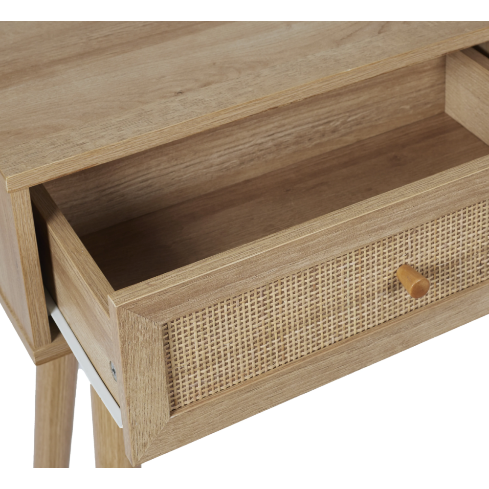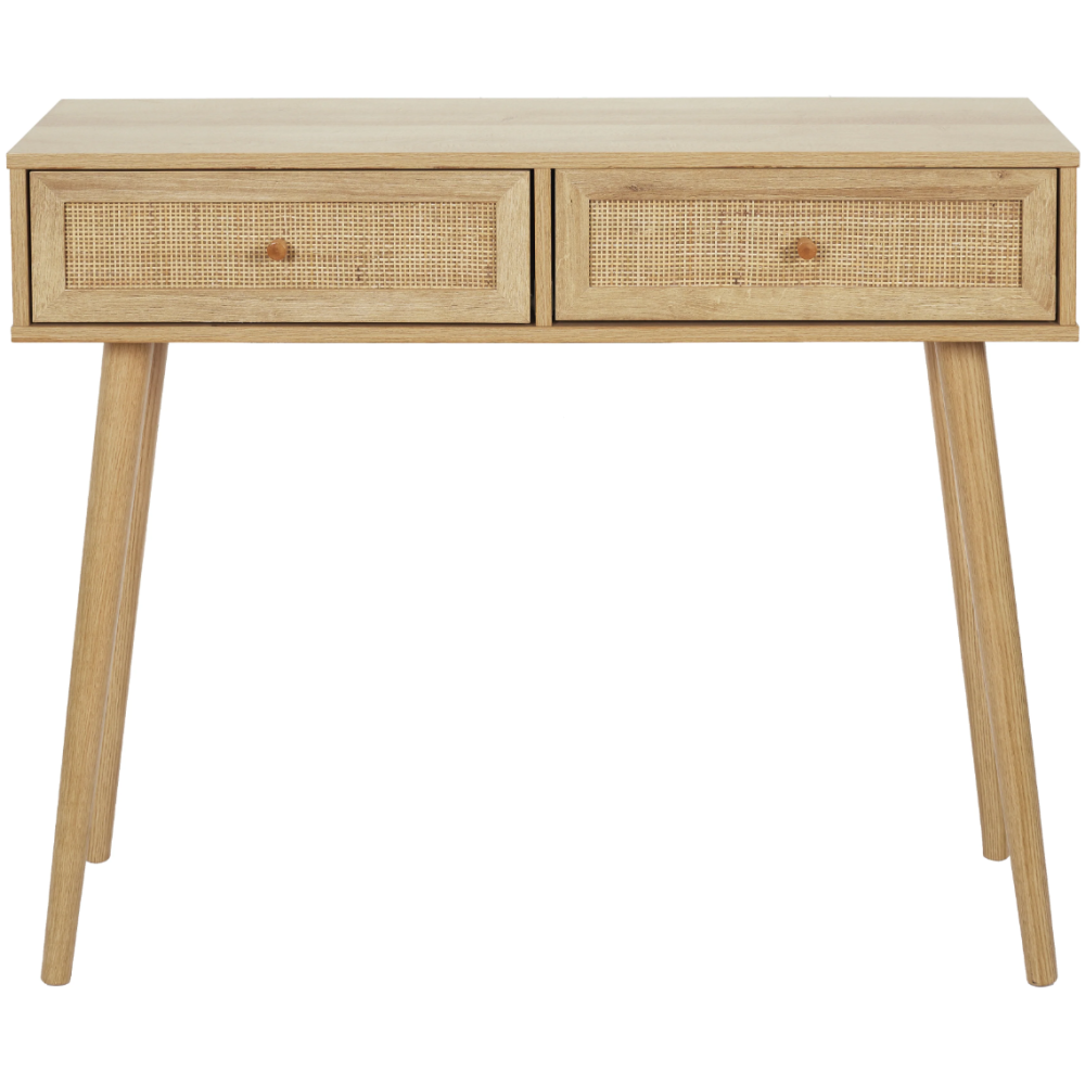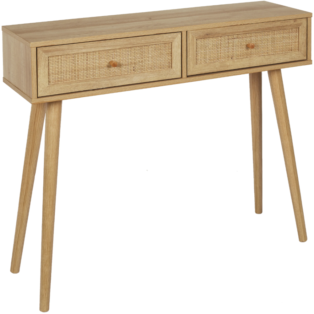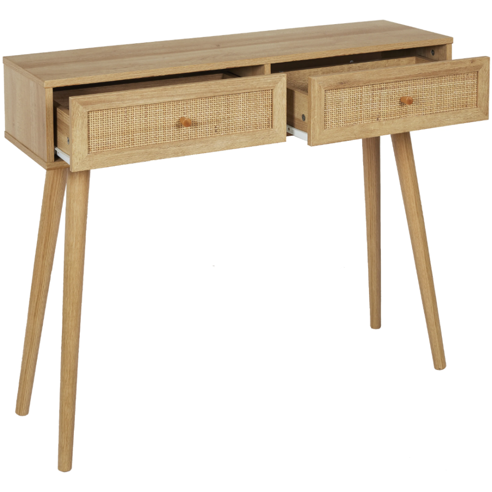Console Bali à disposer à l’entrée intérieure d’une maison - Composée de 2 larges tiroirs pouvant accueillir des objets du quotidien de toute nature - Possède un plateau supérieur idéal pour disposer des outils décoratifs de tailles différentes - Convient pour rehausser le hall d’entrée des maisons modernes - Posée sur 4 longues pattes fabriquées en bois de pin et assurant la stabilité du meuble - A installer à souhait dans n’importe quelle pièce de la maison - Fait exactement 81 cm de haut, 100 cm de long et 29 cm de large - Possède des détails en rotin qui ajoute une touche particulière au déco boisé du meuble.