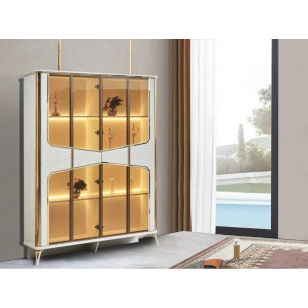 Armoire vitrée mesurant 190 cm de large, 225 cm de haut et 46 cm de profondeur -Dispose de 4 portes et posée sur 5 supports stabilisateurs de couleur blanche - Présente une structure intégrant de vastes étagères internes conçues pour disposer des objets décoratifs, des bouteilles de vin, des liqueurs, des livres ou de la vaisselle de luxe - Affiche une façade joliment conçue avec des détails uniques comme l’éclairage interne et une vitrine répartie partiellement sur les 4 portes - Se pose rapidement et facilement dans un coin de la salle de séjour.
