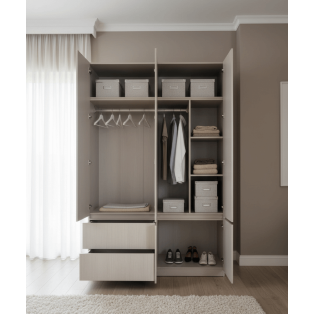 Armoire haute à installer dans n’importe quelle pièce intérieure de la maison et mesurant 160 cm de large, 60 cm de profondeur et 240 cm de haut -Présente un design fin avec des finitions nettes - Fabriquée avec une structure en panneau de particules MDF et des inserts en métal - Conçue avec 6 portes dotées de poignées intégrées et une texture lisse - Propose des espaces de rangement internes divers, avec 2 tiroirs, plusieurs étagères - Embarque une tringle interne pour cintrer des vêtements - Convient pour le rangement des vêtements, chaussures et divers accessoires vestimentaires.