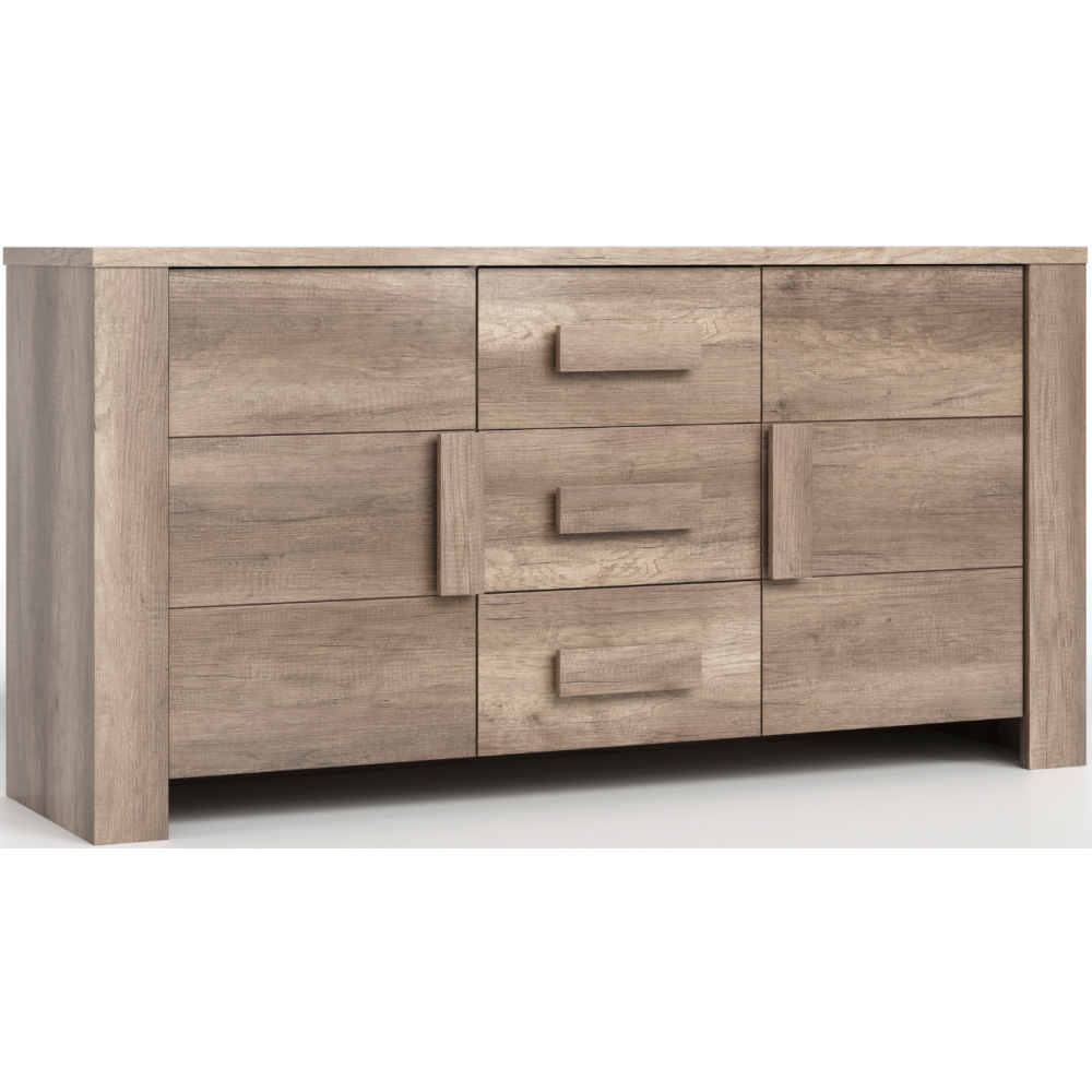 Buffet Fera affichant un design élégant et des finitions sobres - Composé de 3 tiroirs centraux et 2 portes pour organiser le rangement de divers effets - Convient pour être installé dans une chambre, un hall ou une chambre à coucher - Dispose d’une structure solide fabriquée en panneaux de particules - Monté sur deux grands supports qui servent également de plaques latérales du meuble - Dimensions du buffet : 168 cm de large, 85 cm de haut et 47 cm de profondeur.