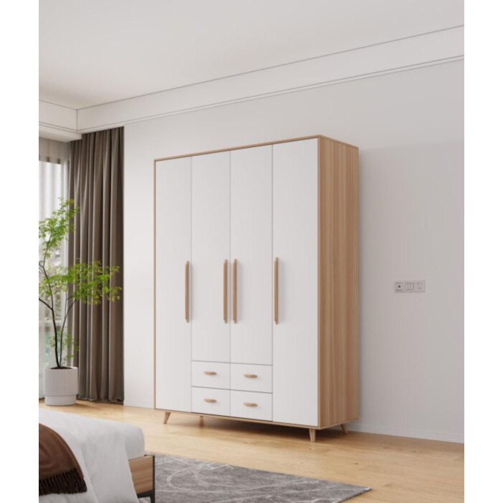 Armoire haute à disposer dans une chambre à coucher - Permet le rangement des textiles, des vêtements et d’objets vestimentaires divers - Inclut des étagères internes permettant d’organiser le rangement par type d’éléments dans le meuble - Comprend 4 tiroirs et 4 portes offrant des possibilités de rangement nombreuses et polyvalentes - Affiche un joli design simpliste avec une façade toute blanche et des bordures boisées - Mesure exactement 160 cm de large, 200 cm de haut et 50 cm de profondeur.