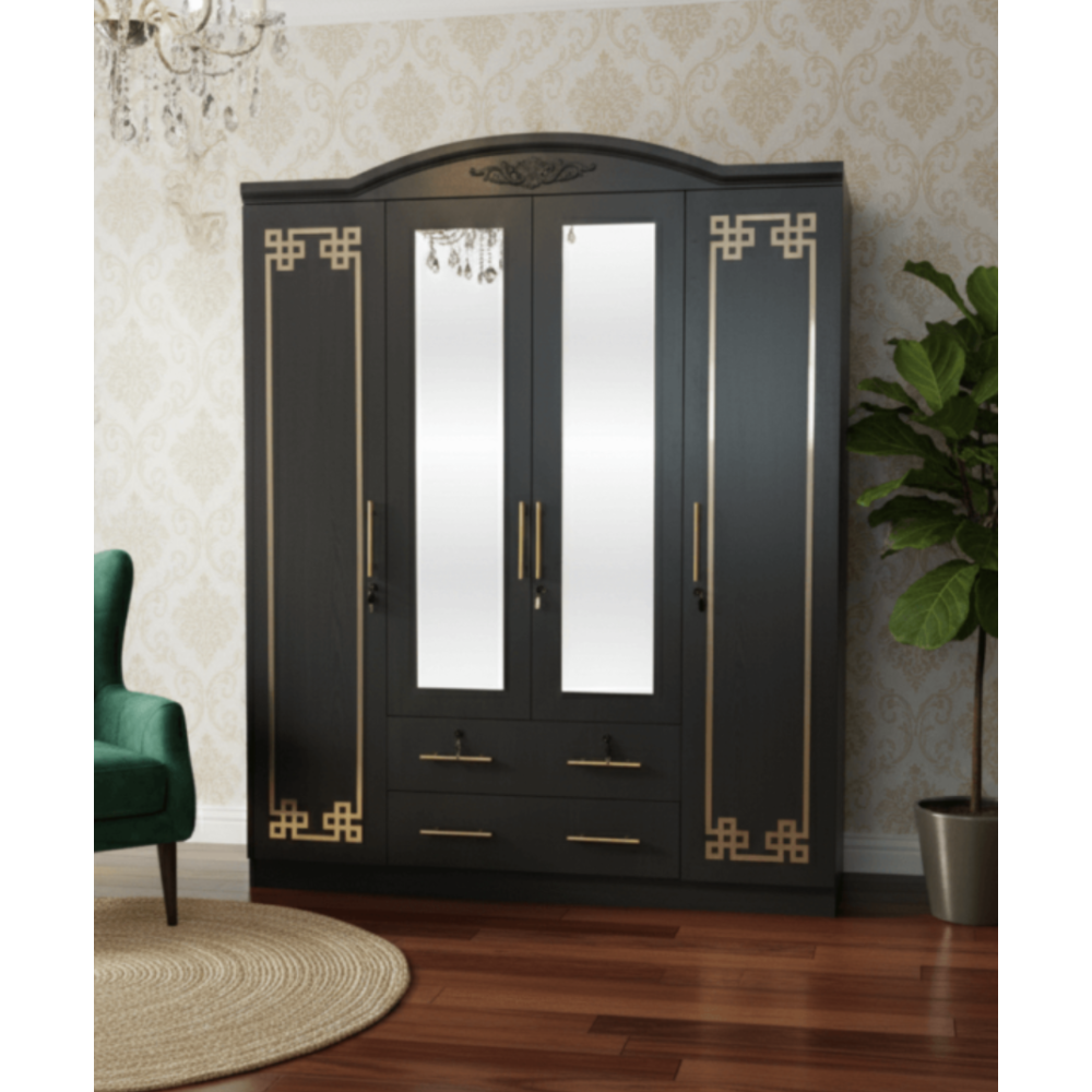 Armoire dotée de 4 portes et des inserts de miroirs à l’avant - Dispose de 4 tiroirs bas qui permettent d’organiser le rangement des textiles, vêtements ou objets divers - Mensurations exactes de l’armoire : 160 cm de long, 210 cm de haut et 50 cm de profondeur - Présente un décor particulier avec des motifs de style royal - Posée sur un socle compact et discret - Dotée d’un coloris noir et d’une texture lisse qui offre un beau rendu visuel du meuble.