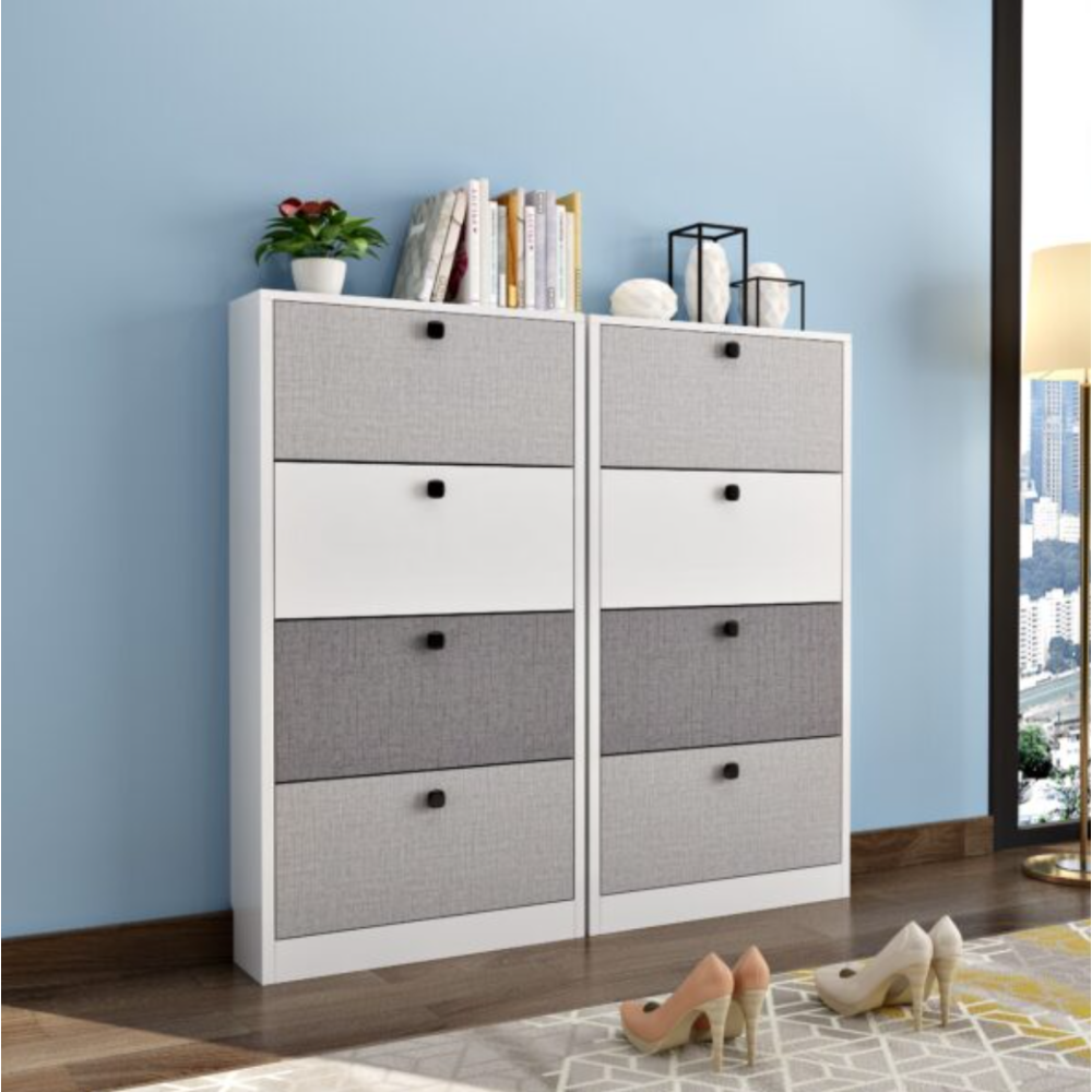 Meuble chaussures composé de 4 étagères de rangement offrant une capacité d’environ 15 paires de chaussures - Dispose de 2 portes à l’avant servant à sécuriser le meuble - Monté sur 4 pieds stables fabriqués en bois - Présente un design original avec des décorations en forme de lambris alignés - Affiche une texture lisse et vernie qui rehausse son originalité - Présente un petit plateau supérieur pouvant accueillir des objets décoratifs.