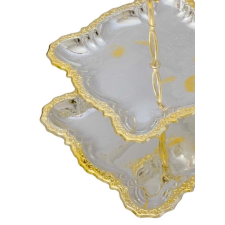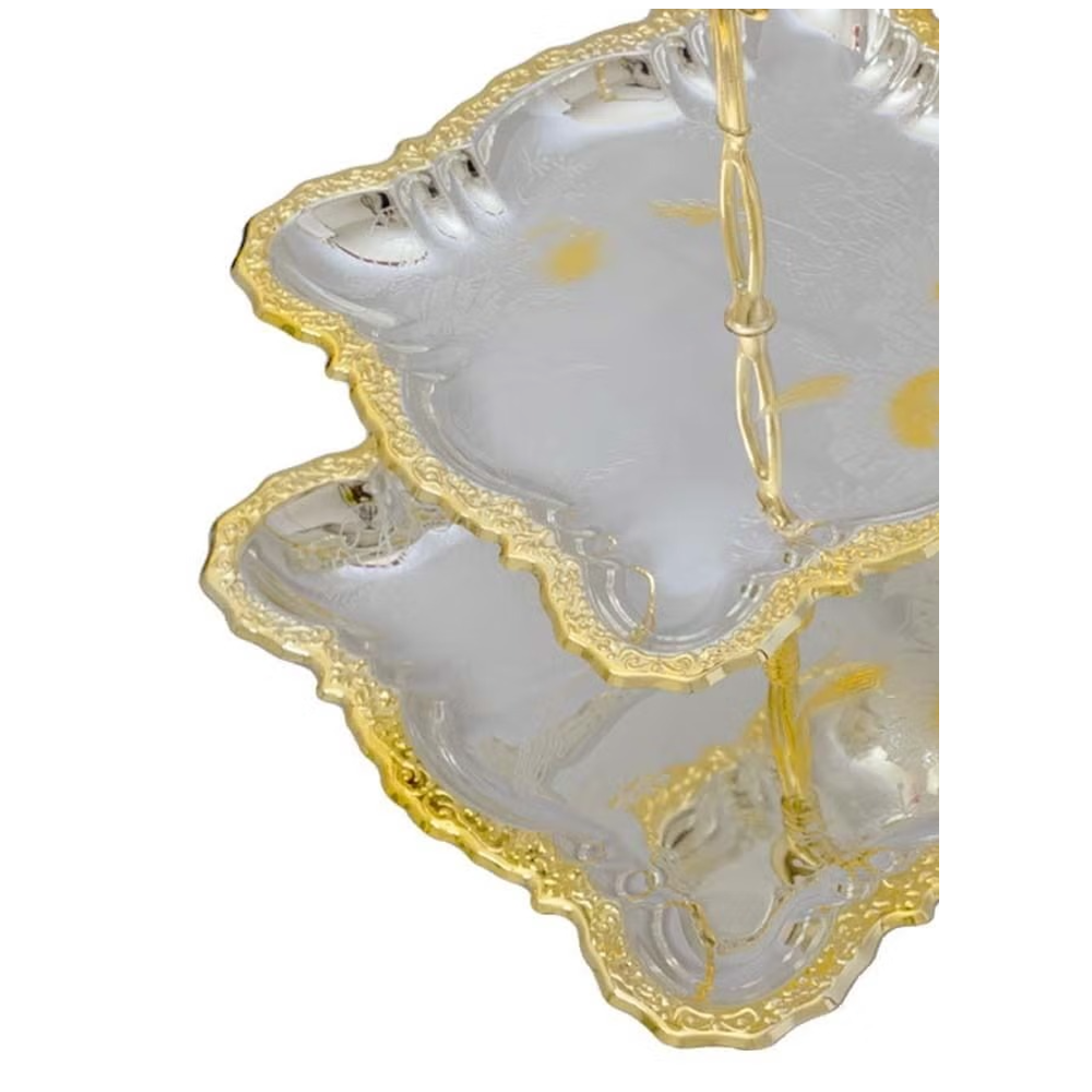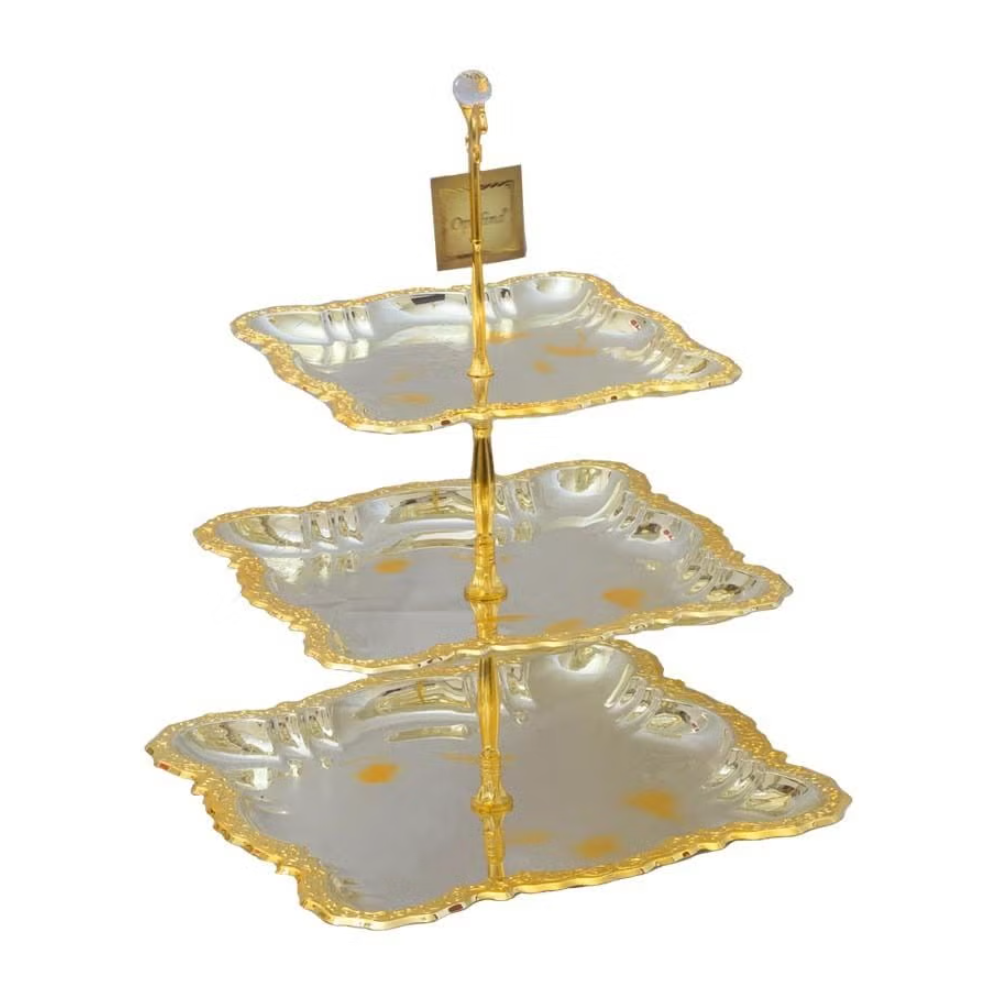 Plateaux 1801SG-S3 3 étages - Grand: 33x33x1 cm - Moyen: 28x28x1 cm et Petit: 23x23x1 cm - Fabriqué de manière à éviter toute déformation - Résiste aux taches et aux odeurs, ce qui facilite le nettoyage - Fabriqué avec des matériaux de haute qualité pour une utilisation intensive - Acier Inoxydable - Couleur: Argent et doré.