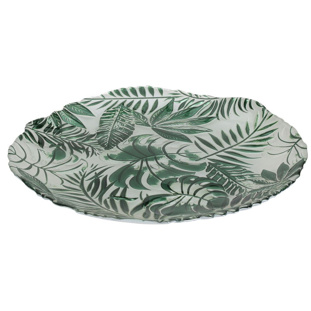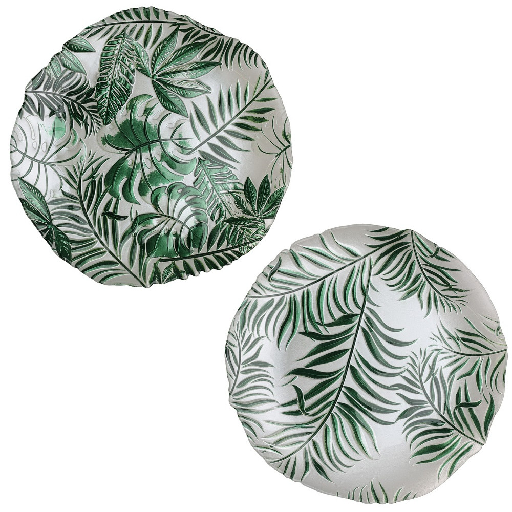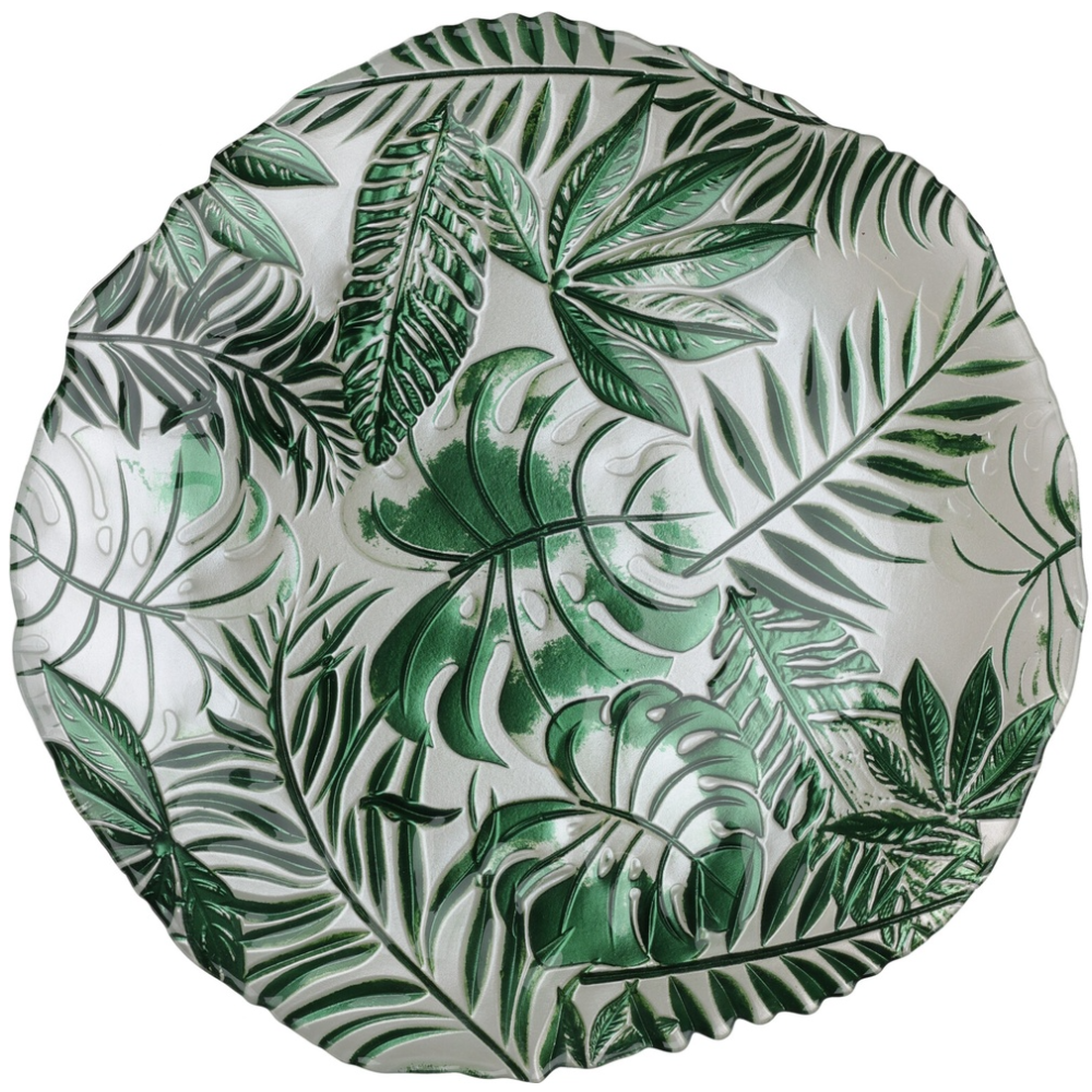 Assiette feuille tropicale - Matière : Verre - Coloris : 3 vert assorti - Inspirée de la nature, elle complètera votre décoration de table - Elément de vaisselle élégant et durable - La décoration est appliquée par le bas, ce qui rend la surface de l'assiette lisse et facile à nettoyer - Parfait pour servir des gâteaux, des fruits ou des collations froides - Dimension : 28 cm de diamètre - Vendu à l'unité selon disponibilité.