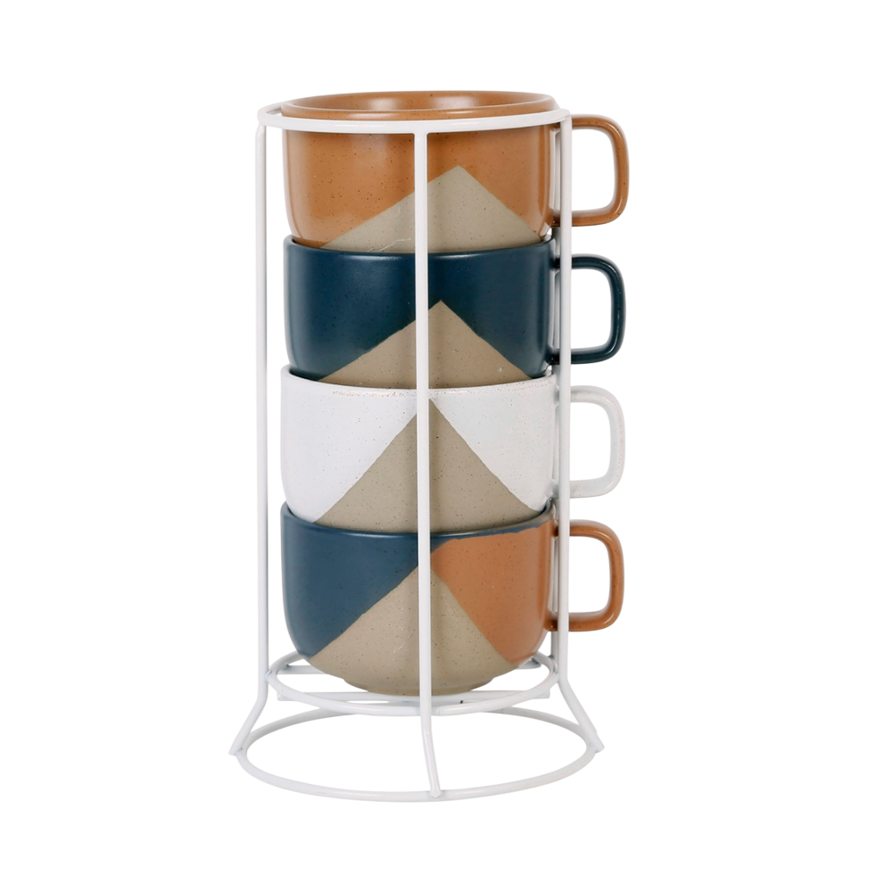 Lot de 4 mugs "Ethnikaa" - Matière du mug - tasse - bol - Grès (Céramique) - Matière du rack: Acier inoxydable - Contact alimentaire: Oui - Empilable: Non - Lave-vaisselle: Oui - Capacité (ml): 250 ml - Usage: Intérieur - Dimensions : L.12 x l.12 x H.22,2 cm - Dimensions élément : Dimensions du mug/tasse/bol : L. 11 x P. 8,3 x H. 9 cm - Dimensions du rack : L. 11,8 x P. 9,5 x H. 21,5 cm - Poids : 1,13 Kg.