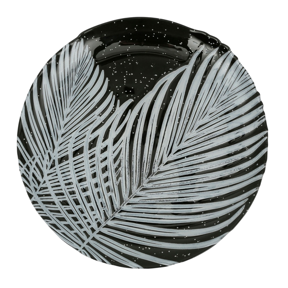 Apportez une touche d’élégance exotique à votre table avec le plat Majorque en verre noir. Son design raffiné, orné de motifs de feuilles tropicales blanches sur fond noir profond, évoque la beauté des soirées estivales méditerranéennes. Fabriqué en verre de haute qualité, ce plat allie robustesse et style. Idéal pour présenter vos plats principaux, fruits ou apéritifs avec distinction, il s’intègre parfaitement dans une décoration moderne ou naturelle. Diamètre : 33 cm. Facile à entretenir, il sublimera vos repas du quotidien comme vos réceptions.