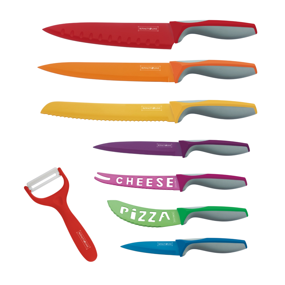 Le set de couteaux Royalty Line RL-COL7A est un ensemble complet de 7 pièces conçu pour répondre à tous vos besoins en cuisine. Il comprend un couteau de chef, un couteau à pain, un couteau à viande, un couteau universel, un couteau à éplucher, un couteau à pizza et un couteau à fromage, ainsi qu’un éplucheur pratique pour fruits et légumes. Chaque lame est en acier inoxydable avec revêtement anti-adhésif pour des coupes nettes, une grande durabilité et un nettoyage facilité. Les poignées ergonomiques colorées offrent confort, sécurité et une prise en main stable. Ce set allie fonctionnalité, design moderne et polyvalence, idéal pour les cuisiniers amateurs comme confirmés qui souhaitent équiper leur cuisine avec style et performance.