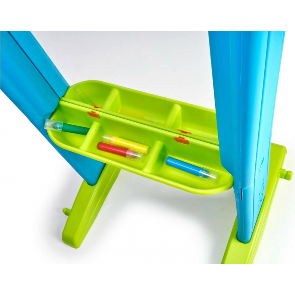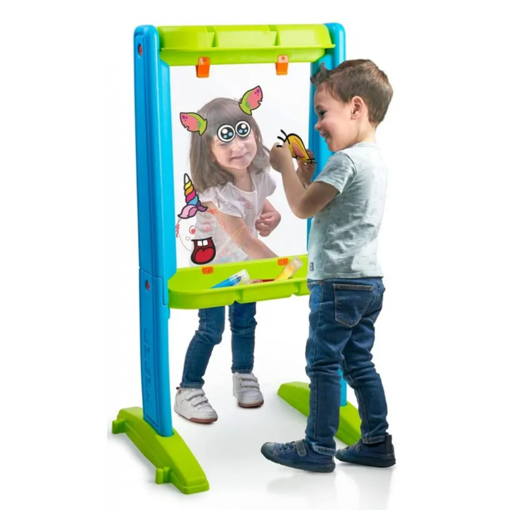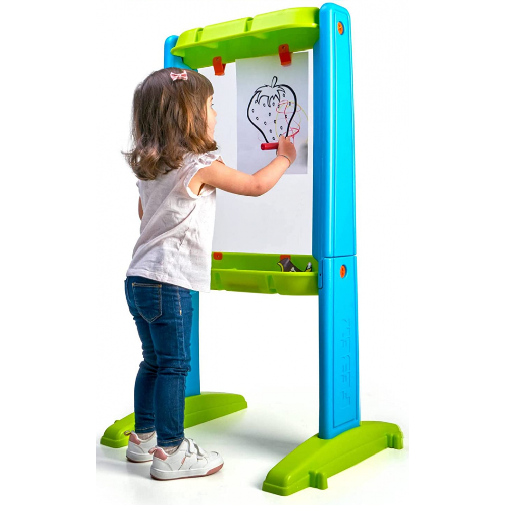 ART & FUN BOARD de FEBER est un tableau blanc transparent et artistique à utiliser des deux côtés, avec de très belles couleurs Il a des éléments de fixation spéciaux intégrés pour positionner certains des modèles inclus ou d'autres à dessiner et à tracer ; vous pouvez également utiliser le tableau blanc librement sans gabarits Comprend 4 marqueurs de couleur et un plateau intégré en bas pour les placer et divers autocollants pour décorer Idéal pour jouer à l'intérieur et à l'extérieur de la maison, car, comme tous les produits FEBER , il est résistant à la lumière et changements brusques de température Aide à développer les habiletés cognitives et motrices, encourageant le jeu; recommandé pour les enfants de plus de 3 ans.