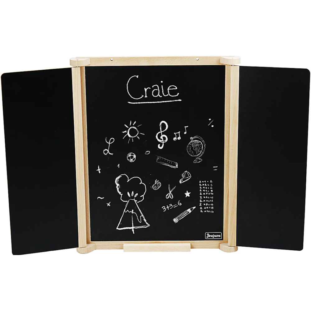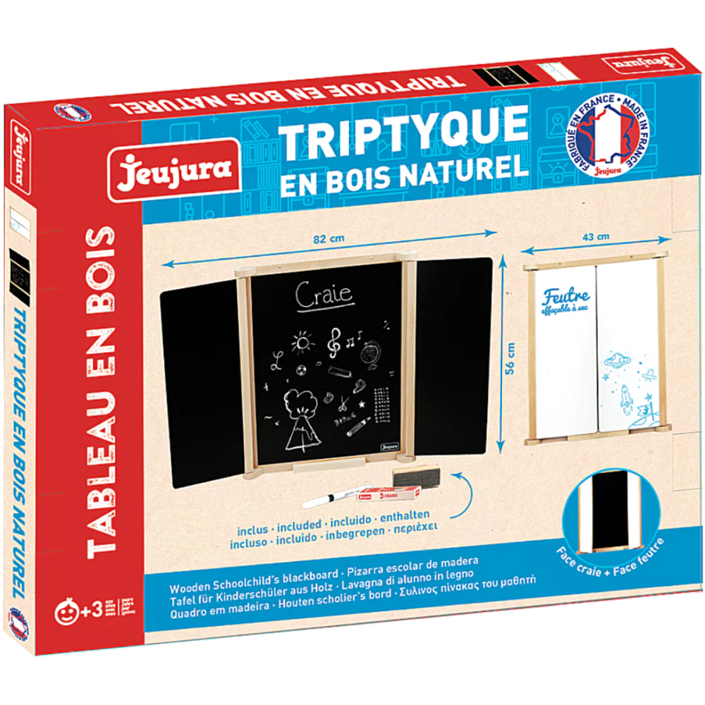 Tableau triptyque mural fabriqué en bois naturel - Constitué d’une ardoise centrale pour écrire à la craie et deux volets avec face pour la craie et une face pour feutre effaçable Fourni avec des accessoires comme 3 craies, 1 feutre effaçable à sec, 1 brosse à tableau et un plumier en bois - Dimensions du tableau : 82 cm de long et 56 cm de large et 56 cm de haut - Monté sur un support bien travaillé permettant d’ouvrir ou de refermer l’ardoise comme un livre - Dispose d’un format léger qui permet de le transporter aisément dans une mallette ou un sac à main.