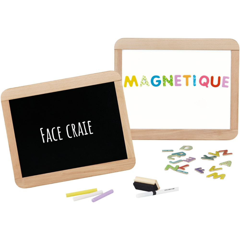 Tableau triptyque mural fabriqué en bois naturel - Constitué d’une ardoise centrale pour écrire à la craie et deux volets avec face pour la craie et une face pour feutre effaçable Fourni avec des accessoires comme 3 craies, 1 feutre effaçable à sec, 1 brosse à tableau et un plumier en bois - Dimensions du tableau : 82 cm de long et 56 cm de large et 56 cm de haut - Monté sur un support bien travaillé permettant d’ouvrir ou de refermer l’ardoise comme un livre - Dispose d’un format léger qui permet de le transporter aisément dans une mallette ou un sac à main.