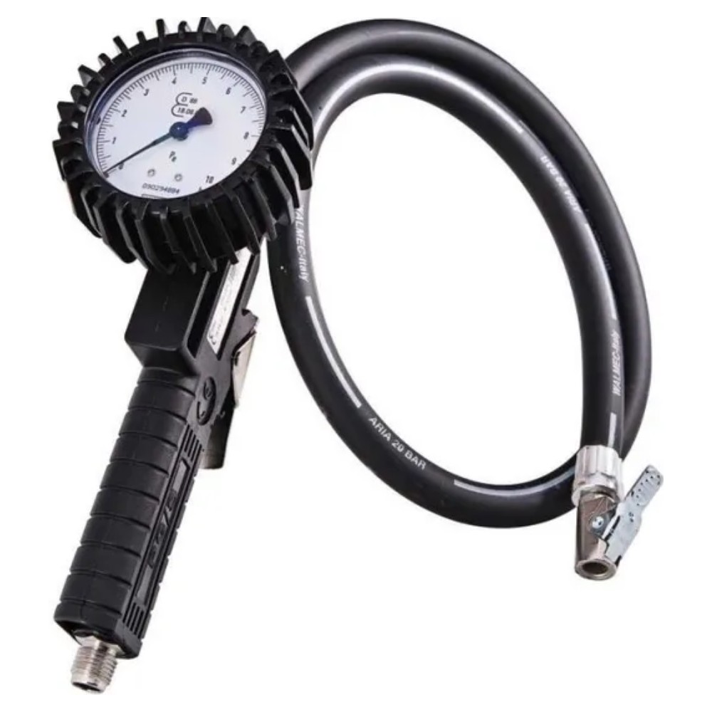 Manomètre de gonflage avec manomètre. Pression graduée de 0 à 10 bars maxi. Ce pistolet de gonflage est équipé d'une valve spéciale qui assure la précision du manomètre pendant le travail. Informations techniques. Pistolet de gonflage homologué. La poignée dispose d'une gâchette de gonflage avec 2 positions réglables. Pour dégonfler, la gâchette doit être positionnée de façon horizontale. Type de raccord côté arrivée d'air : raccord rapide.