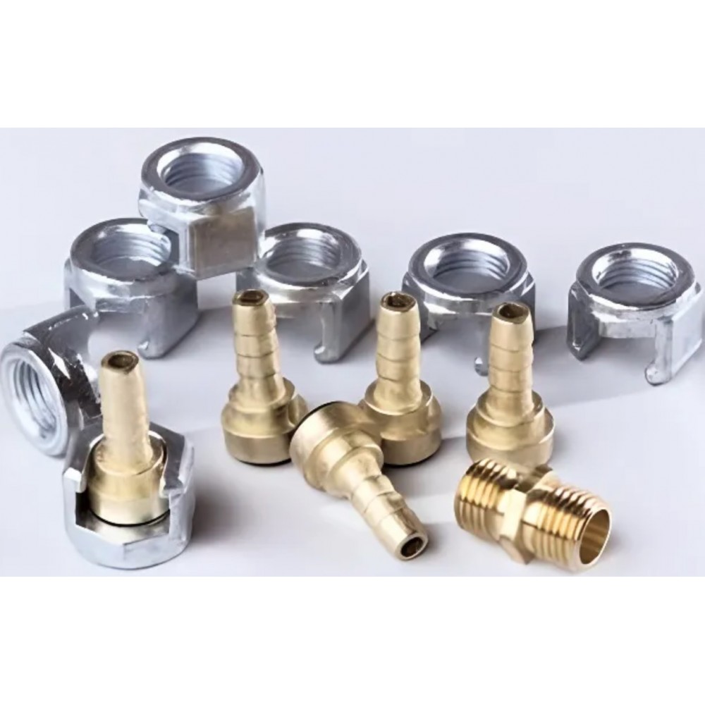 Raccords pneumatiques pour compresseur. Divers raccords pneumatiques pour adapter votre compresseur ou à tout autre type d'appareil pneumatique. Informations techniques. Contient un total de 13 raccords pneumatiques : 5 raccords mâles, 7 écrous baïonnettes, 1 raccord de jonction. Dimensions : raccords mâles : longueur : 3 cm, diamètre : 0,8-1,9 cm. Écrous : diamètre 2 cm, hauteur : 2 cm. Raccord : longueur : 2,3 cm, diamètre 1,8 cm. Matière : métal. Poids total : 180 g environ. Coloris : gris et doré.