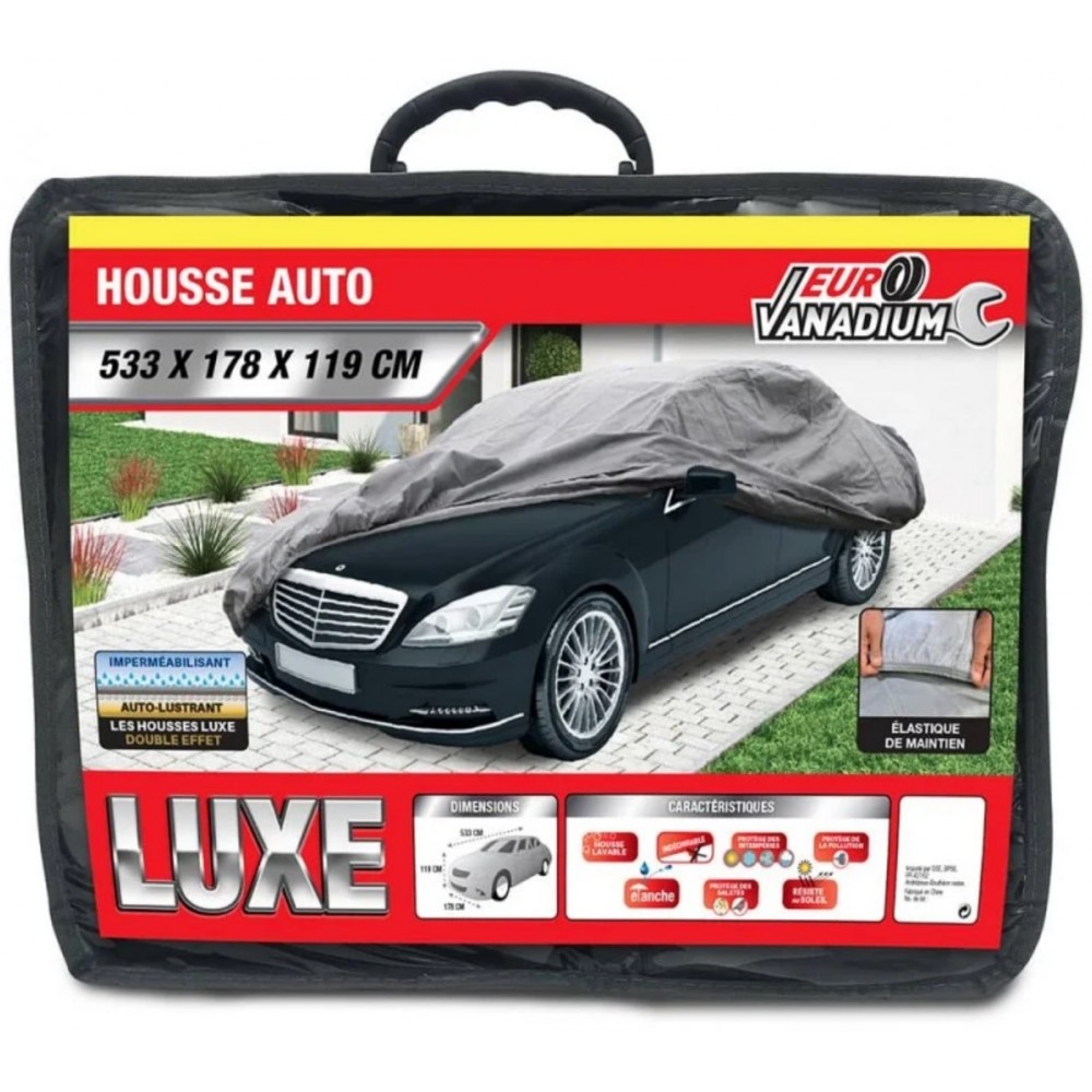 Housse auto luxe. Dimensions : l. 533 x l. 178 x h. 119 cm. Matière : polypropylène non tissée. Poids : 3 kg environ. Coloris : gris. Grammage : 65g/m² (peva) - 70g/m² (polypropylène coton). Housse double protection : 1 - Imperméabilisant côté extérieur 2- Auto-lustrant côté voiture. Lavable en machine. Indéchirable. Étanche. Résiste au soleil.