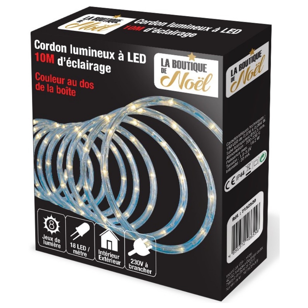 Cordon lumineux a led clignotant 10m rouge-dimensions totales : l. 11,5 m x Ø 10,5 mm. Cable : l. 1,5 m. Cordon : l. 10 m matière : pvc et câble en caoutchouc. Poids : 1,6 kg environ. Coloris : tube transparent et câble noir. Puissance : 19,2 w (0,036 à 0,064 w par led). Alimentation : secteur (220-230 v). Tension : 1,8-3,6 w. Intensité : 20 ma. Éclairage : 180 led. Couleur : rouge. Normes : ip44, ce. Mode d’éclairage : 8 jeux de lumière. Intérieur et extérieur.