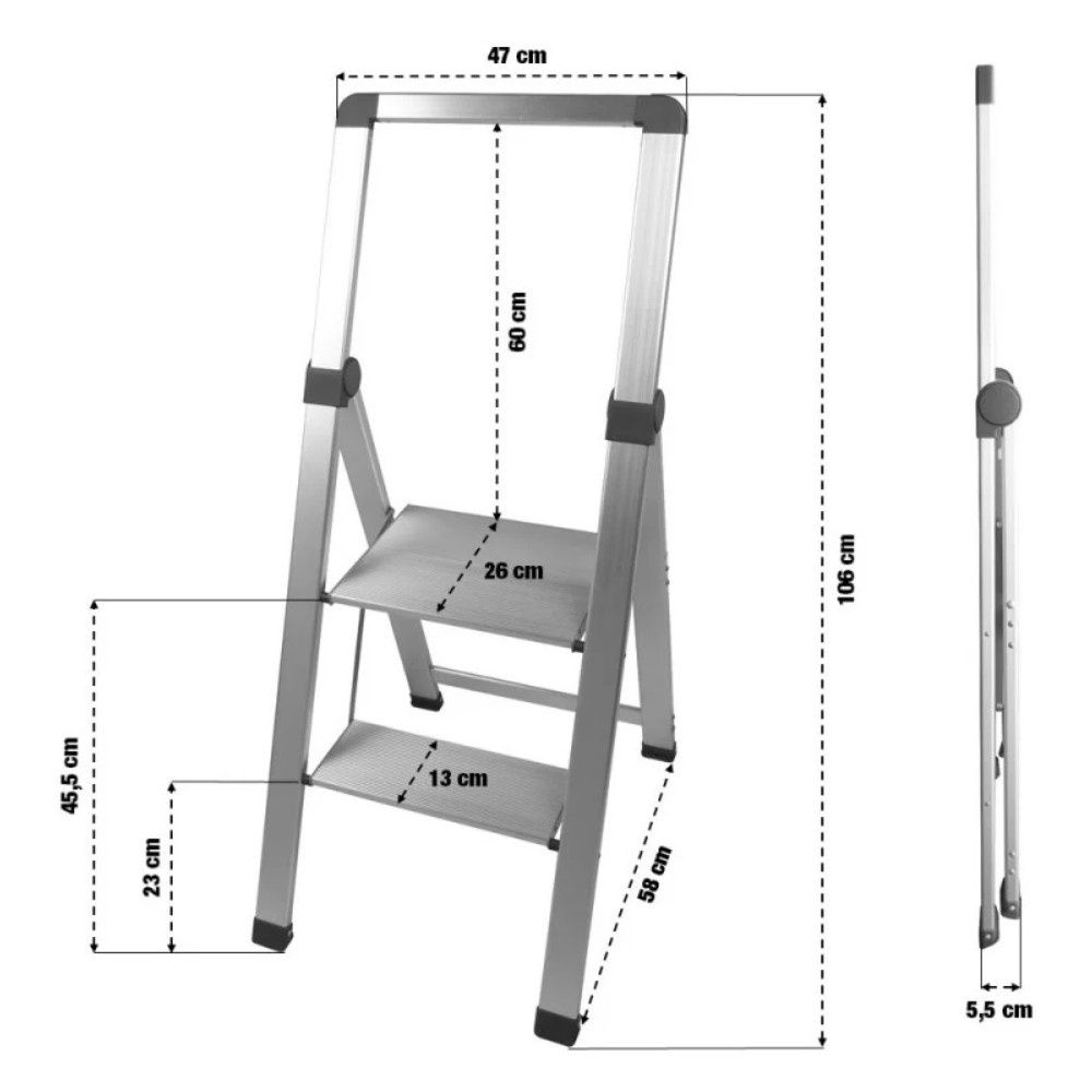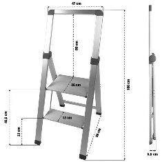 Solidité à toute épreuve pour porter jusqu'à 150 kg. Équipé de larges marches striées et de 4 patins antidérapants, il procure un sentiment de sécurité pour attraper des objets en hauteur ou effectuer des travaux domestiques. Résiste bien à l'humidité grâce à sa composition en aluminium. Petit par sa hauteur, cet escabeau 2 marches sera un allié de taille dès que vous aurez besoin de vous surélever ! Matière : aluminium. Dimensions ouvert : - hauteur : 106 cm - largeur : 47 cm - profondeur : 58 cm. Dimensions plié : - hauteur : 116 cm - largeur : 47 cm - profondeur : 5,5 cm. Hauteur de travail : 2,05 m. Poids : 4,2 kg. Charge max : 150 kg. Coloris : gris. Normes : conforme à la norme européenne EN 14183 s'appliquant aux petits marchepieds (dernière marche inférieure à 1,00 m).