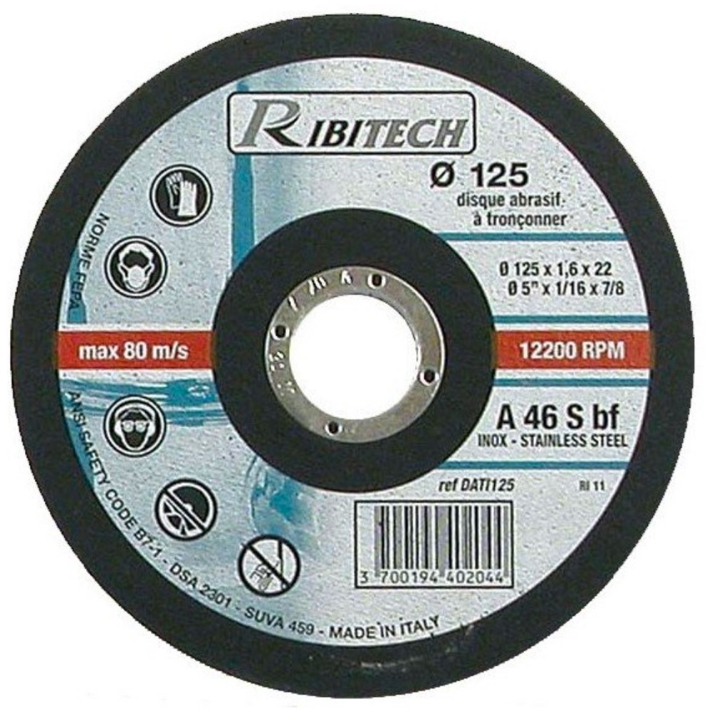 Disques abrasifs à tronçonner l'inox. Disques plats. Diamètre 125 x épaisseur 1,6 x al. 22mm.