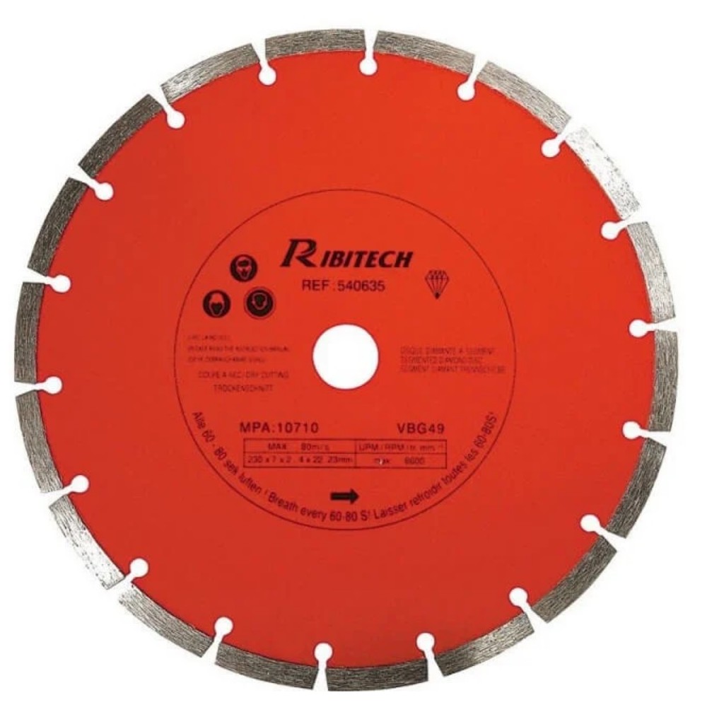 Disque Diamant Segmenté 230mm. Spécialement conçu pour coupe rapide de bétons, pavés, briques, bordures, parpaings, etc. Sciage à sec ou humide. Contient 1 disque diamant à jante segmentée. 13 000 rotations par minute (au maximum), 80 m/seconde. Axe intérieur de 2 cm. Diamètre 230 mm.