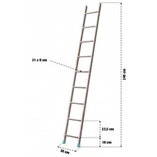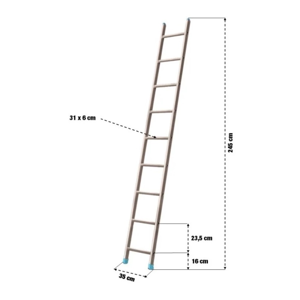 Matière : aluminium. Dimensions :largeur barreaux : 31 cm, largeur totale : 35 cm, largeur des montants : 6 cm, hauteur : 245 cm, distance entre le sol et le 1er barreau : 16 cm, distance entre 2 barreaux : 23,5 cm. Cette échelle simple en aluminium comporte 9 barreaux.