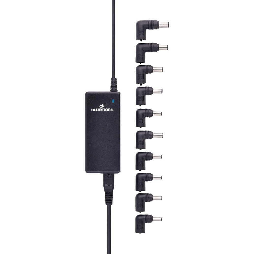 Alimentation secteur universelle Bluestork BS-PW-NB-65/2 avec 10 embouts - Tension de sortie de 15V, 16V, 18,5V, 19V, 20V à 22V DC (Selon l’embout constructeur utilisé) 5A Max. - Pratique et simple d’utilisation. - Alimentation universelle : fonctionne dans toute l’Europe sans avoir à utiliser un convertisseur de tension.