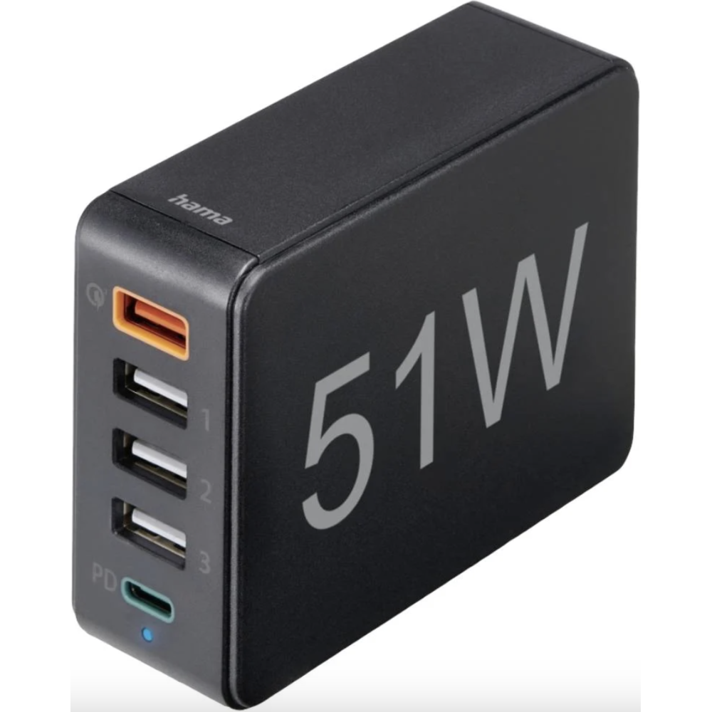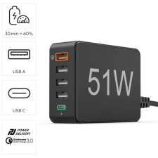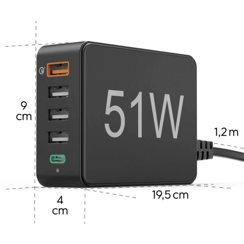 Station de charge USB 5 ports - Puissance totale : 51 W - 1 port USB-C Power Delivery - 1 port USB-A Quick Charge 3.0 - 3 ports USB-A standards - Charge rapide et sécurisée - Détection automatique des appareils - Protection contre surchauffe, surtension et court-circuit - Utilisation intérieure - Câble d’alimentation 1,2 m inclus - Compatible smartphones, tablettes, power banks - Coloris : noir - Tension d’entrée : 100 – 240 V - Courant de sortie max : 3 A.