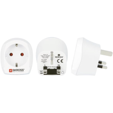 Adaptateur de voyage Europe vers Royaume-Uni SKROSS - Compatibilité : Appareils 2 et 3 pôles (Schuko / Euro) - Tension d'entrée : 100 – 250 V - Puissance max. : 1300 W (100 V) / 3250 W (250 V) - Dimensions : 56 × 64 × 64 mm | Poids : 71 g - Couleur : Blanc - Référence produit : SKR1500230 - Code-barres : 7640166320265.