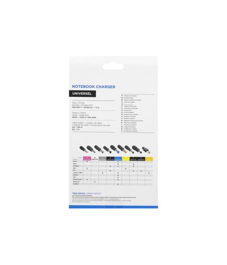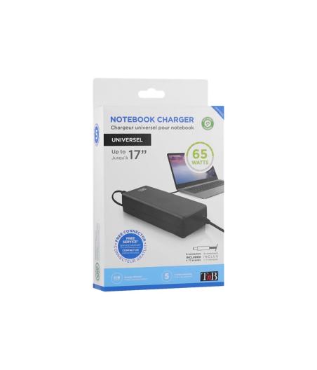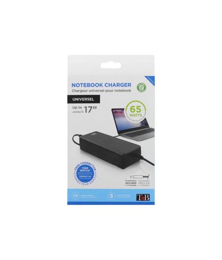 Chargeur universel pour laptop jusqu’à 15,6" - Marque : T'NB - Référence : CHNB19V65 - Compatible avec tous les laptops 19V (65W max) - Pack complet : 9 embouts inclus, compatibles avec Lenovo, HP, Asus, Acer, Samsung, Sony, Toshiba, Packard Bell, MSI… - Entrée : AC 100-240V, 50-60Hz, 1,3A - Sortie : DC 19V, 3,42A - Longueur câble : 120 cm (AC), 150 cm (DC) - Puissance maximale : 65 W - Utilisation : secteur - Couleur : noir - EAN : 3303170044988.