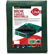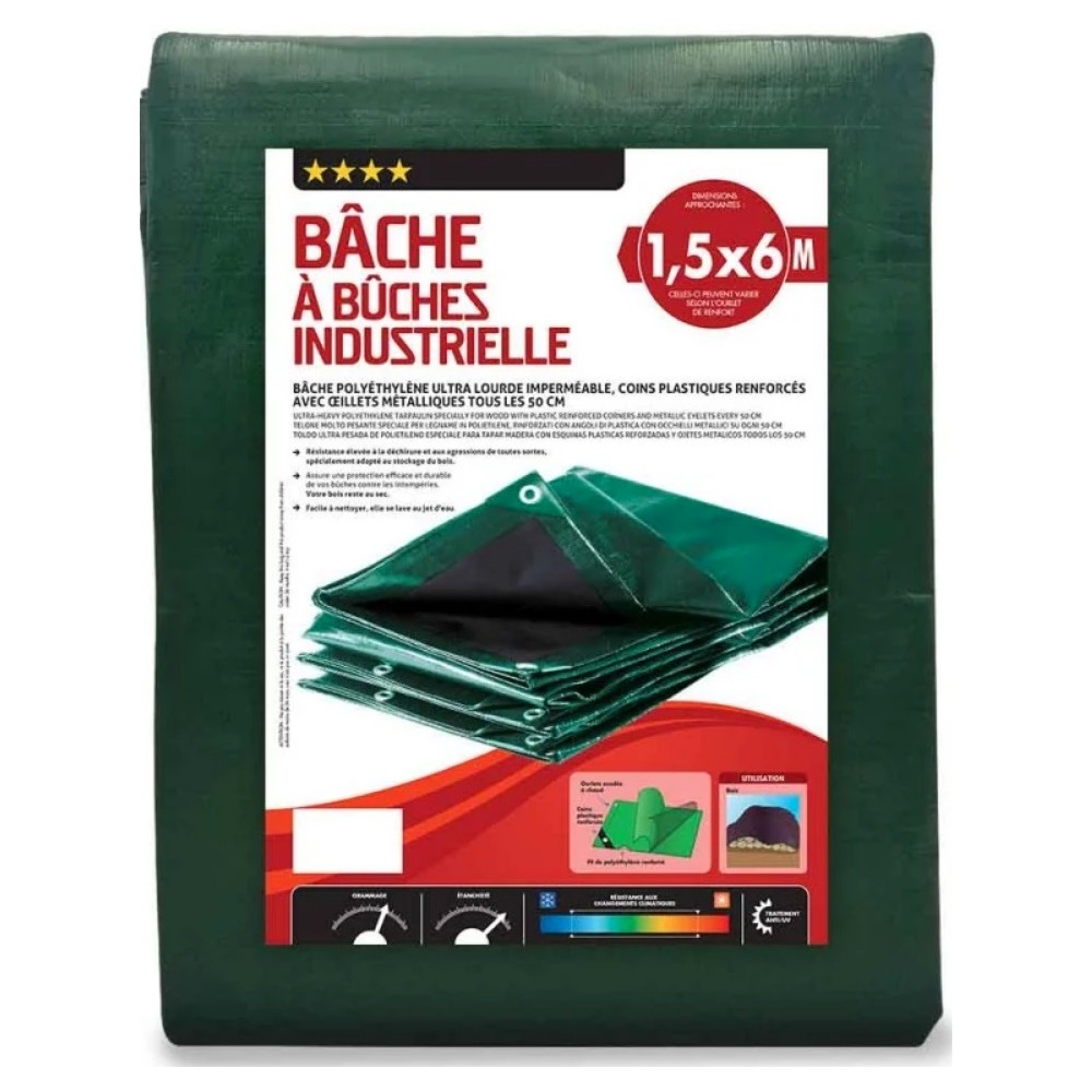 Bâche industrielle 1,5 x 6 m. 240 g/m²-dimensions : 2 x 8 m. Matière : fils de polyéthylène renforcés et œillets métalliques. Poids : 2,1 kg environ. Coloris : vert et dessous noir. Grammage : 240 g / m². Imperméable. traitement anti-uv. Coins renforcés en plastique. Œillets métalliques tous les 50 cm.