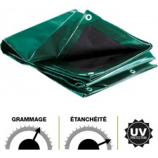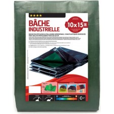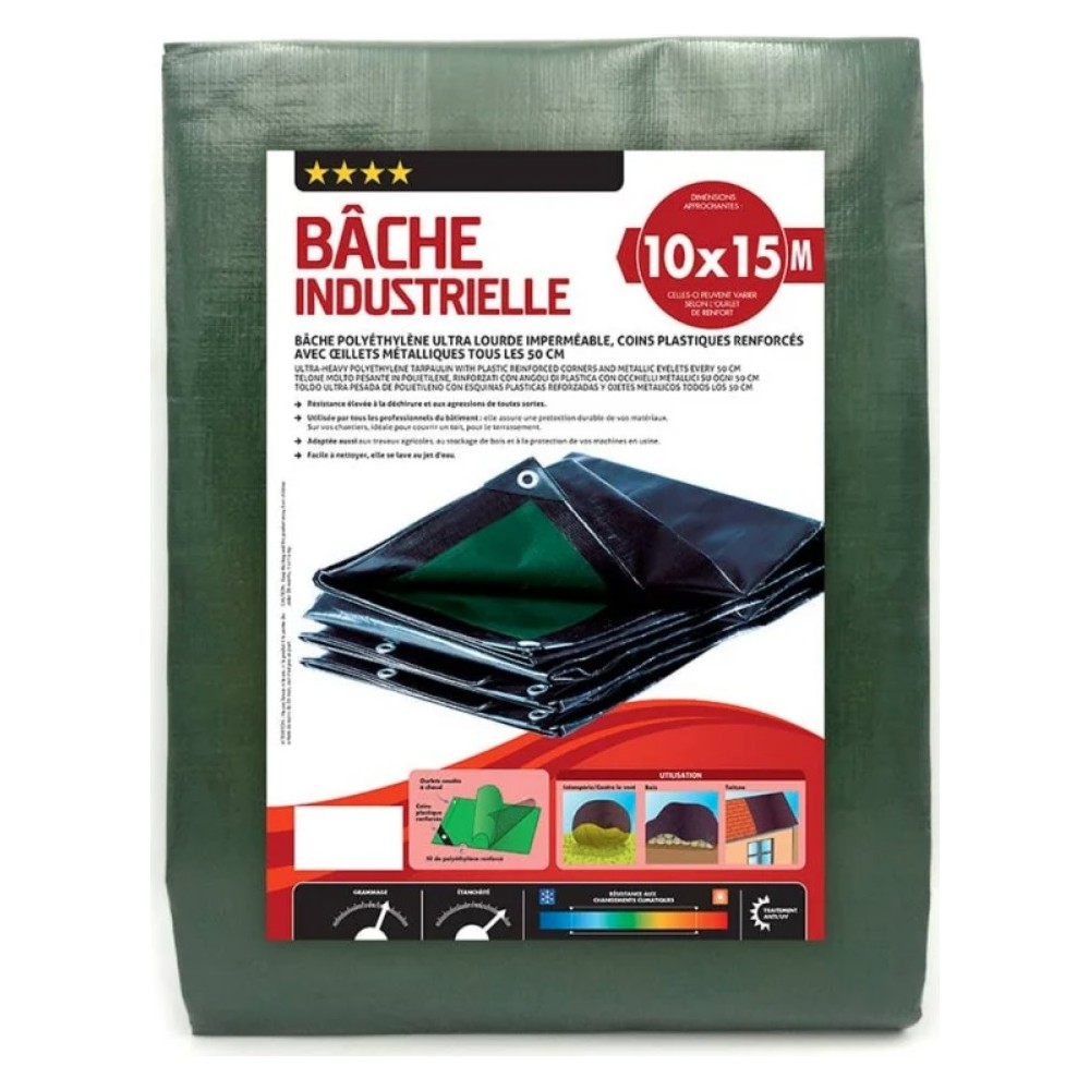 Bâche industrielle. 10 x15 m. 240 g/m-dimensions : 10 x 15 m. Matière : fils de polyéthylène renforcés et œillets métalliques. Poids : 36,120 kg environ. Coloris : vert et dessous noir. Grammage : 240 g/m². Imperméable. Traitement anti-uv. Coins renforcés en plastique. Œillets métalliques tous les 50 cm.