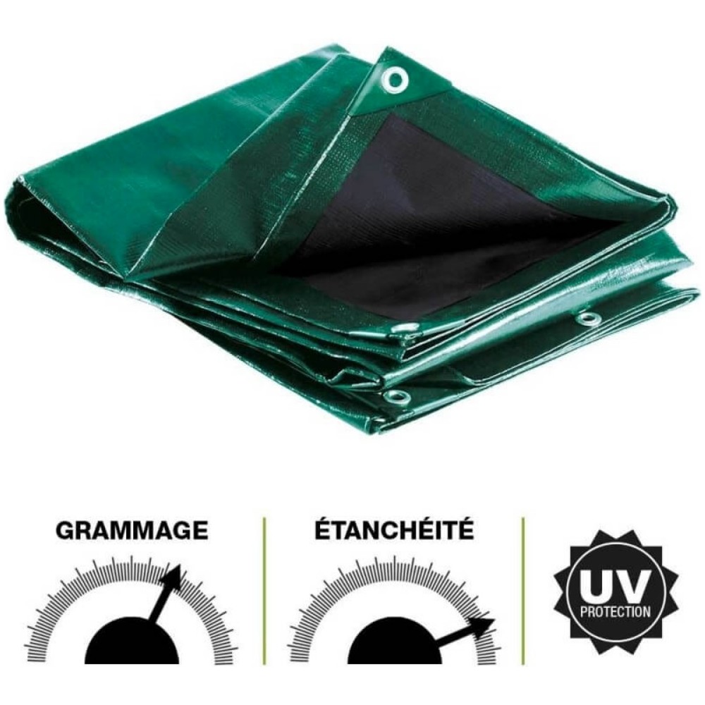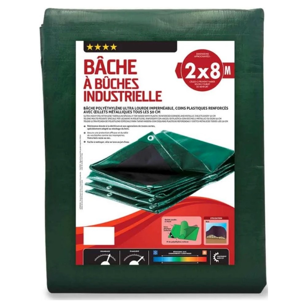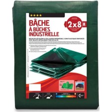 Bâche industrielle 2 x 8 m. 240 g/m²-dimensions : 2 x 8 m. Matière : fils de polyéthylène renforcés et œillets métalliques. Poids : 3,7 kg environ. Coloris : vert et dessous noir. Grammage : 240 g / m². Imperméable. traitement anti-uv. Coins renforcés en plastique. Œillets métalliques tous les 50 cm.