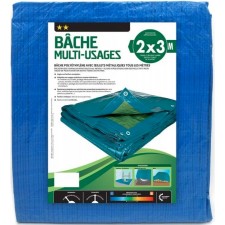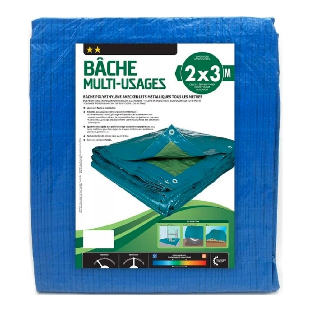 Bâche multi-usages 2 x 3 m.-dimensions : 2 x 3 m. Matière : polyéthylène et œillets métalliques. Poids : 360 g. Coloris : bleu. Grammage : 68 g / m². Œillets métalliques tous les mètres. Dimensions indiquées : correspondent à celles de la bâche brute de coupe avant tous travaux de finition et ourlets, il convient donc de déduire environ 20 cm sur la largeur et la longueur afin de connaître la taille finie du produit.