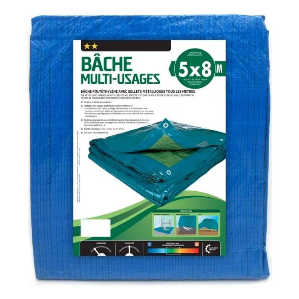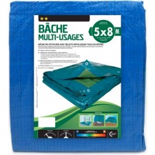 Bâche multi-usages 5 x 8 m.-dimensions : 5 x 8 m. Matière : polyéthylène et œillets métalliques. Poids : 2,220 kg. Coloris : bleu. Grammage : 68 g / m². Œillets métalliques tous les mètres. Dimensions indiquées : correspondent à celles de la bâche brute de coupe avant tous travaux de finition et ourlets, il convient donc de déduire environ 20 cm sur la largeur et la longueur afin de connaître la taille finie du produit.