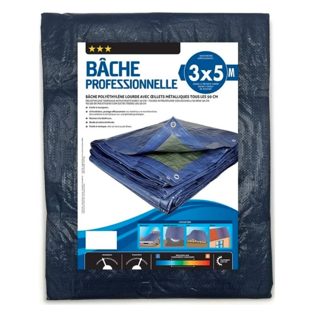 Cette bâche de protection de qualité professionnelle est idéale pour protéger et couvrir tous types de matériaux ou d'activité. Parfaite pour tout type d'utilisation, de travaux domestiques et de chantiers, pour une protection contre les intempéries, la peinture ou des dégradations accidentelles. Légère, fine et souple, cette bâche s'utilise aussi bien en intérieur qu'en extérieur. La bâche professionnelle est fabriquée à partir de polyéthylène de 120g/m², optimisant sa qualité supérieure. Les bords de la bâche professionnelle ainsi que les quatre coins sont équipés d'œillets métalliques espacés tous les 50 cm environ, garantissant une qualité supérieure et durable. Répondant parfaitement aux besoins et exigences d'une protection longue durée, cette bâche pro se lave facilement au jet d'eau.  Dimensions : 3 x 5 m. Matière : polyéthylène et œillets métalliques. Poids : 1,7 kg environ. Coloris : bleu. Grammage : 120 g/ m².