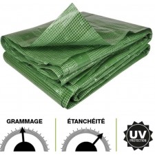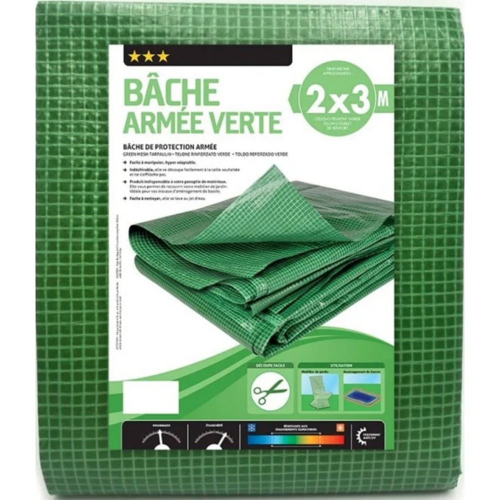 Bâche armée verte 4x3 m. 160g/m²-dimensions : 4 x 3 m. Matière : polyéthylène. poids : 1,990 kg environ. Coloris : vert. Grammage : 160 g/m². Imperméable. Traitement Anti-uv. Bandes de renfort sur les côtés et au centre. Œillets prédécoupés. Dimensions indiquées correspondent à celles de la bâche brute de coupe avant tous travaux de finition et ourlets. il convient donc de déduire environ 20 cm sur la largeur et la longueur afin de connaître la taille finale du produit.
