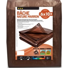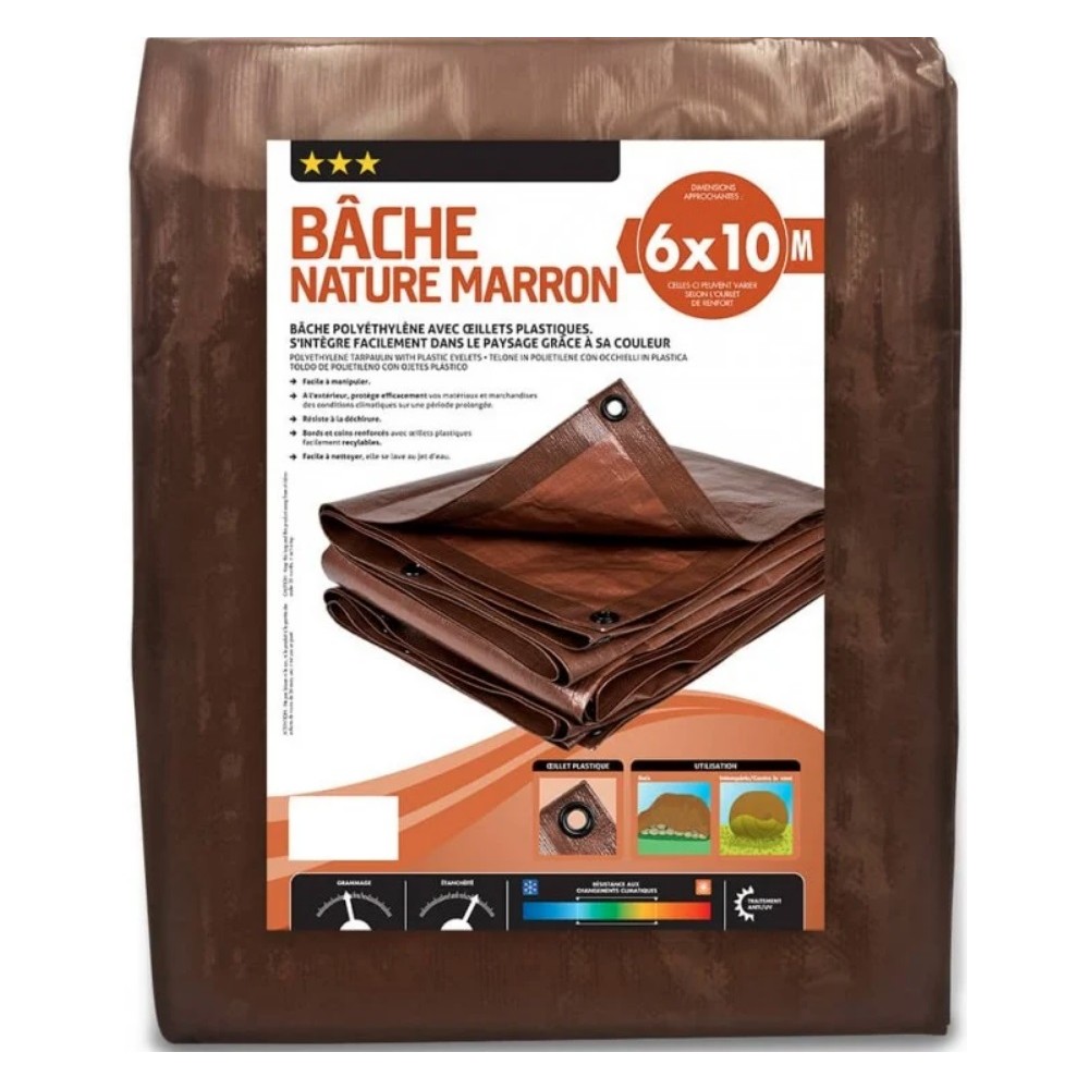 Bâche marron nature 6x10 m. 140 g/m²-dimensions : 6 x 10 m. Matière : polyéthylène. Poids : 7,8 kg environ. Coloris : marron. Grammage : 140 g/m². Œillets plastique noir tous les 50 cm. Bords et coins renforcés. Anti-uv et étanche au vent et à l’eau. Facile à nettoyer : au jet d’eau.