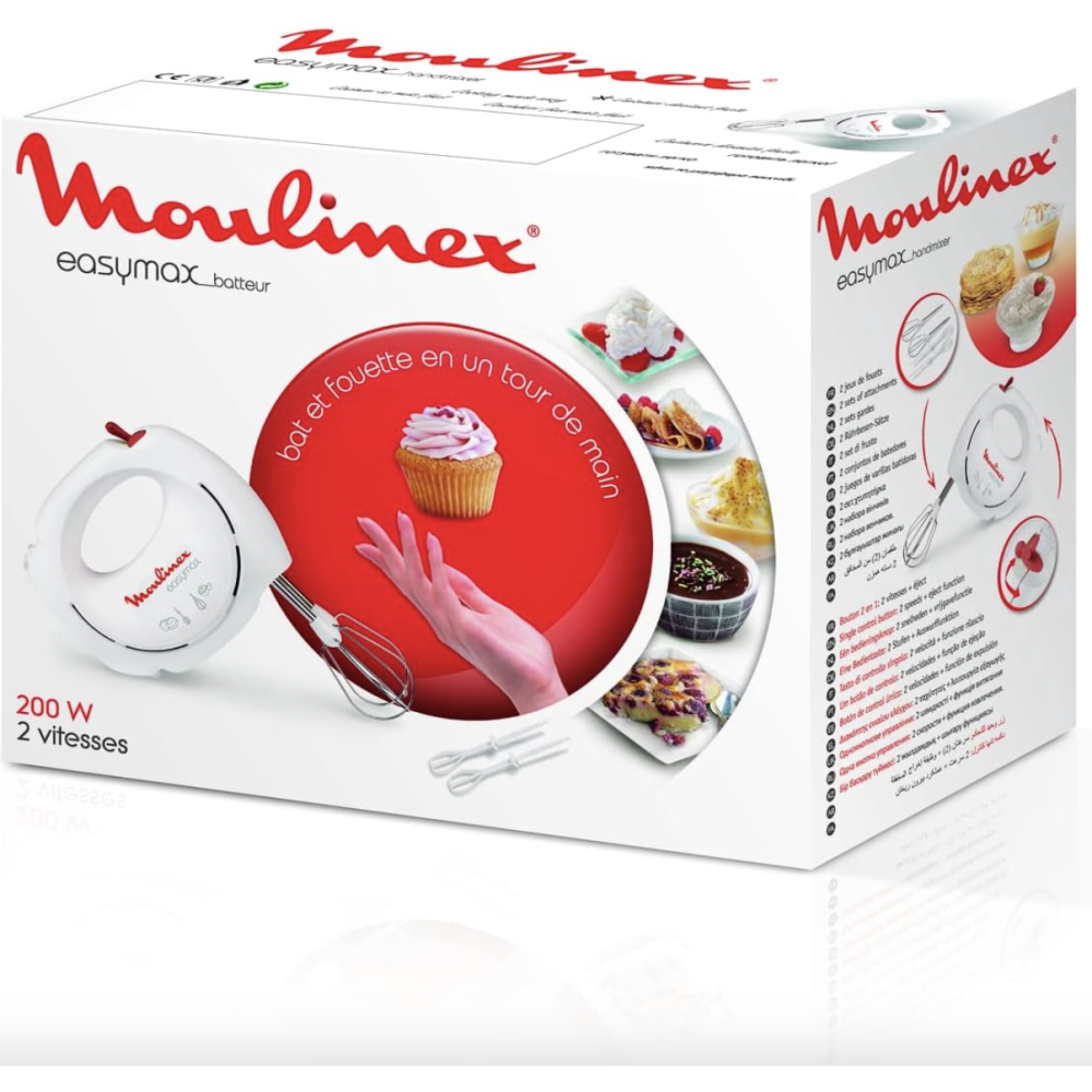Batteur électrique Moulinex ABM11A30 Easy Max - Nombre de programmes : 2 vitesses - Réglages, commandes et voyants : - Vitesse : 2 présélections - Indicateurs : Bouton joystick - Consommation : Puissance électrique : 150W, Rangement du cordon : Enrouleur de cordon, Consommation d'énergie : 200W - Dimensions et poids : Largeur : 16 cm, Hauteur : 14.5 cm, Profondeur : 6.5 cm, Poids : 0.82 kg.