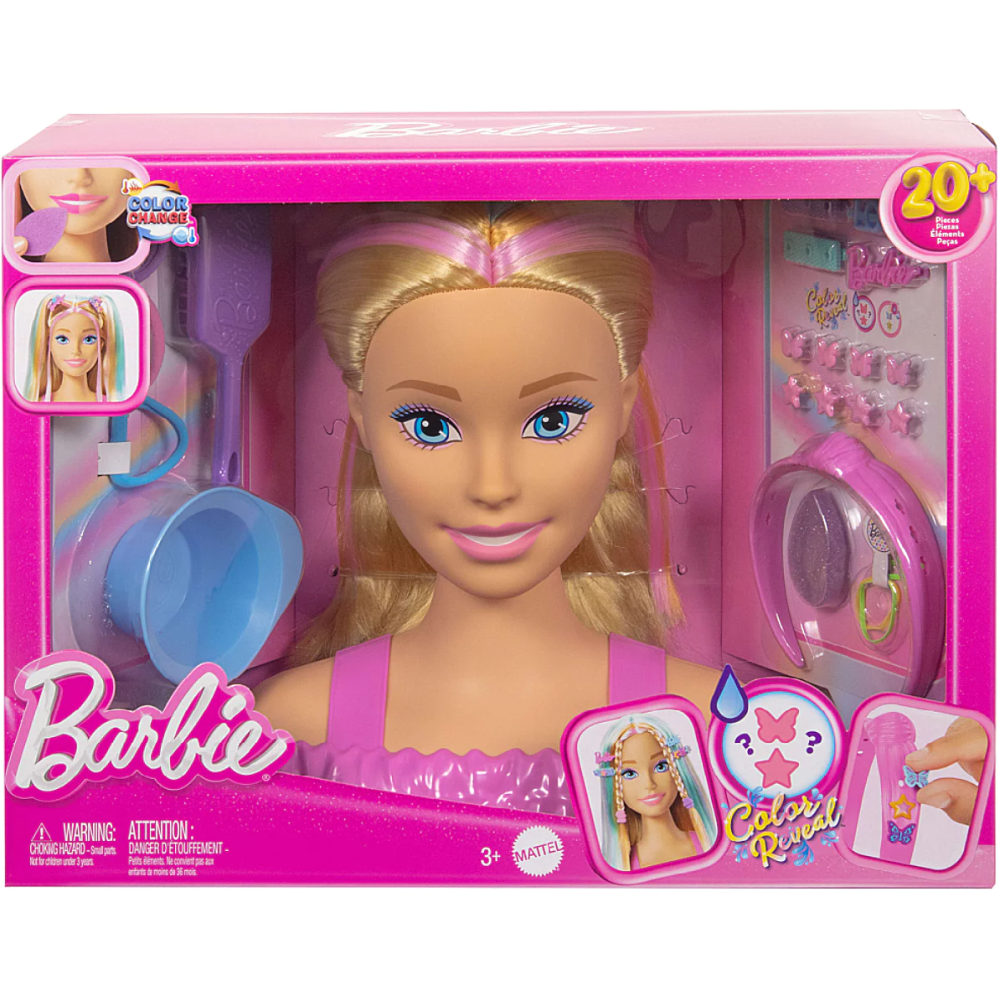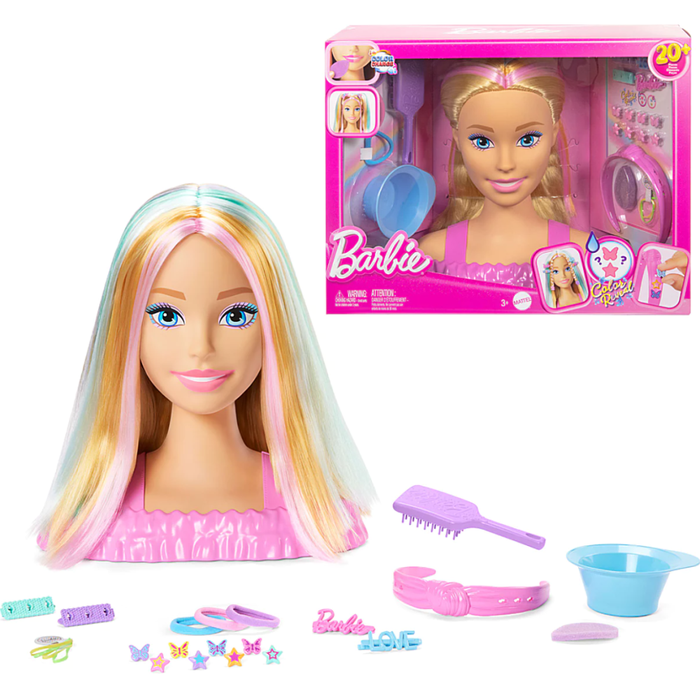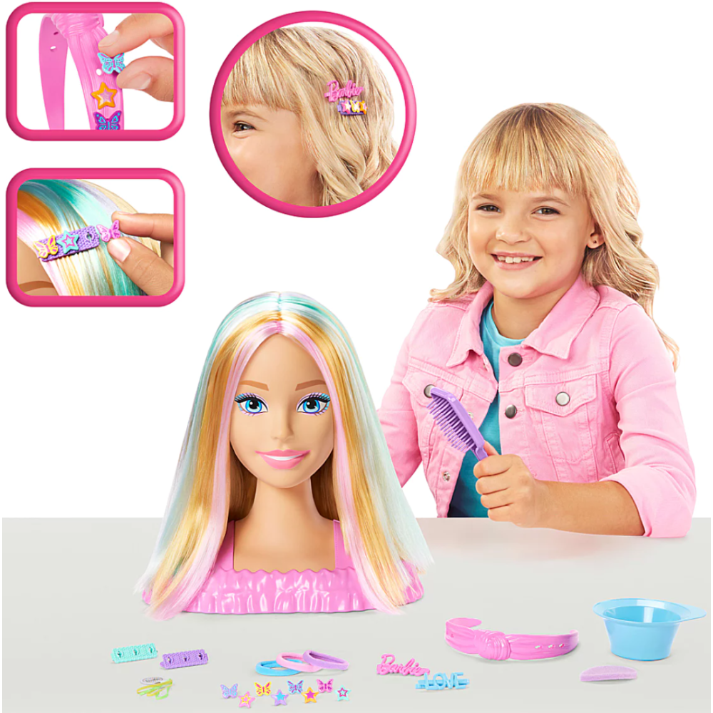 Tête à coiffer Barbie dotée de longs cheveux blonds intégrés de mèches pastel roses, oranges et turquoises pour permettre aux coiffeuses en herbe d’exprimer leur créativité pendant de longues heures - Constitue un excellent cadeau pour les jeunettes de 3 ans et plus intéressées par les jeux de beauté - Proposée avec une brosse pour styler les cheveux de la Barbie de différentes manières : en tresses, chignons, queues de cheval et plus encore - Fournie avec des accessoires de coiffure comme des barrettes, élastiques et bandeaux que les fillettes peuvent utiliser pour assortir leur coiffure à celle de la poupée - Dispose d’accessoires colorés qui changent de couleur au contact de l’eau pour une aventure de beauté encore plus magique.