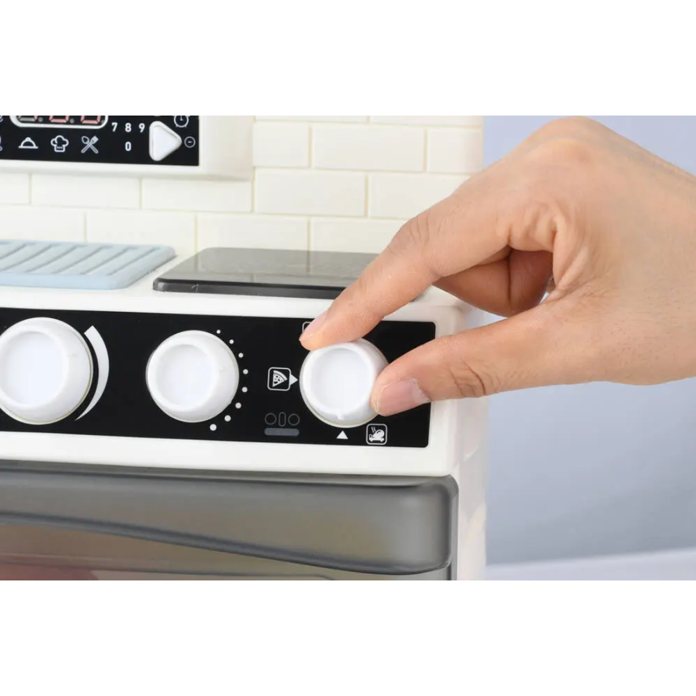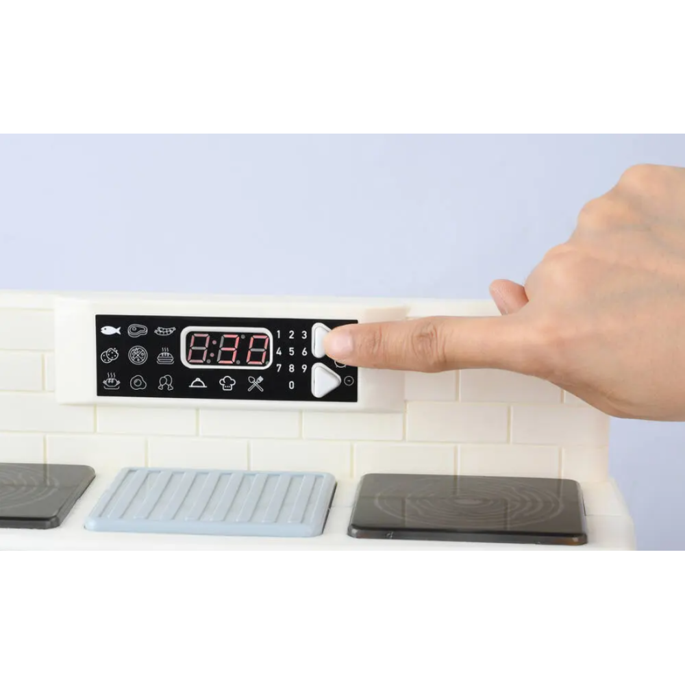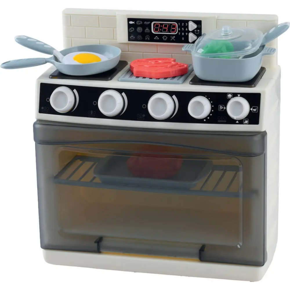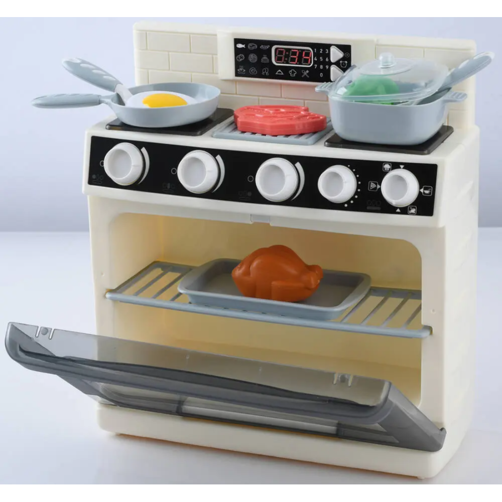 Cuisinière en jouet spécialement fabriquée pour familiariser les tout-petits avec l’univers culinaire - Offre des effets sonores et lumineux réalistes - Encourage le développement de la motricité et stimule l'imagination des enfants tout en leur permettant de s'amuser - Intègre des éléments fabriqués en plastique résistant qui garantissent une utilisation sûre et durable pour les petits chefs en herbe - Fournie avec 2 piles LR6 incluses pour un démarrage immédiat après achat - Inclut une grille et une plaque pour le four, une poêle, une marmite avec couvercle, un morceau de viande rouge, un poulet, un œuf au plat, un légume vert et deux ustensiles - Recommandée pour les enfants de 3 ans et plus.
