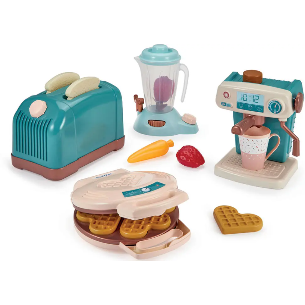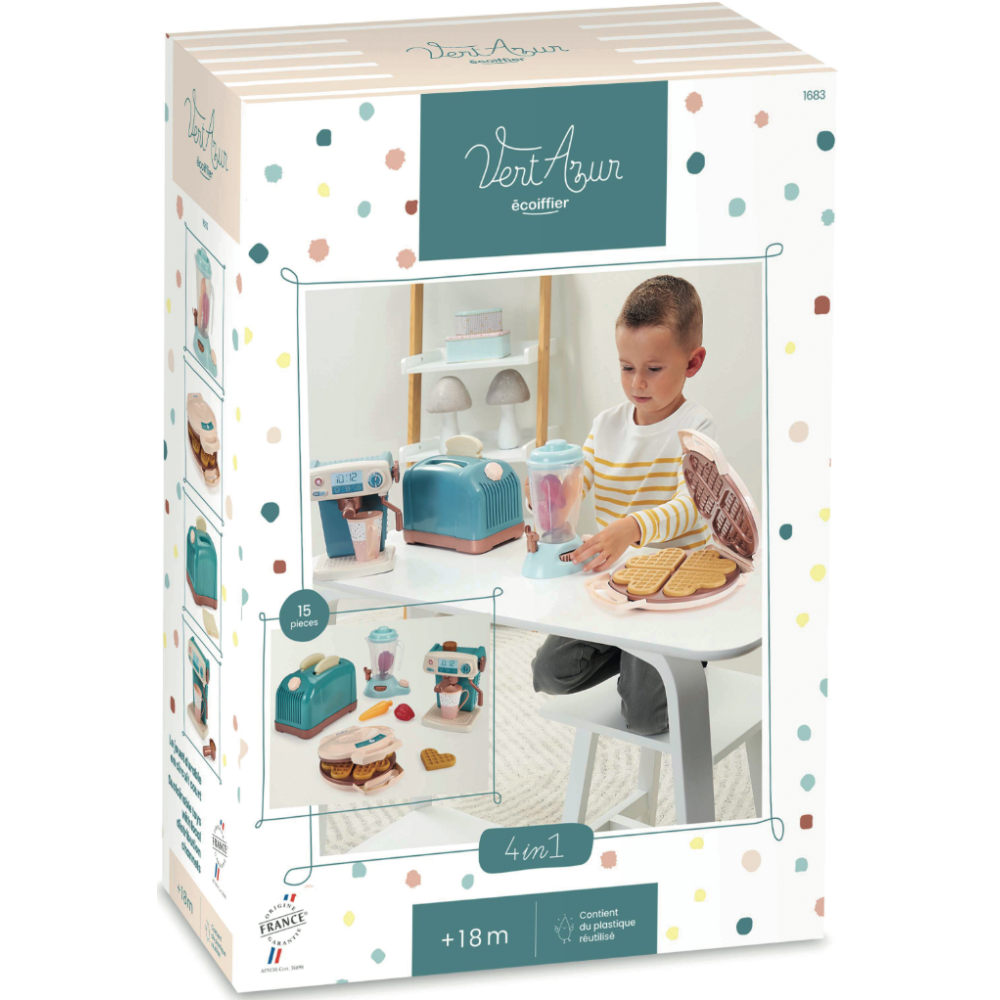 Superpack électroménager 4 en 1 d'Ecoiffier, un jeu d'imitation pour initier les enfants dès 18 mois aux joies de la cuisine - Coloris Vert azur - Contient un toaster, un gaufrier, un blender et un percolateur - Amusant et éducatif - Offre diverses opportunités de jeu comme: griller des tranches de pain, confectionner de délicieuses gaufres, mixer des fruits ou simuler la préparation de boissons chaudes - Stimule la créativité et la motricité fine des enfants - Dimensions: 21 x 17 x 19cm.