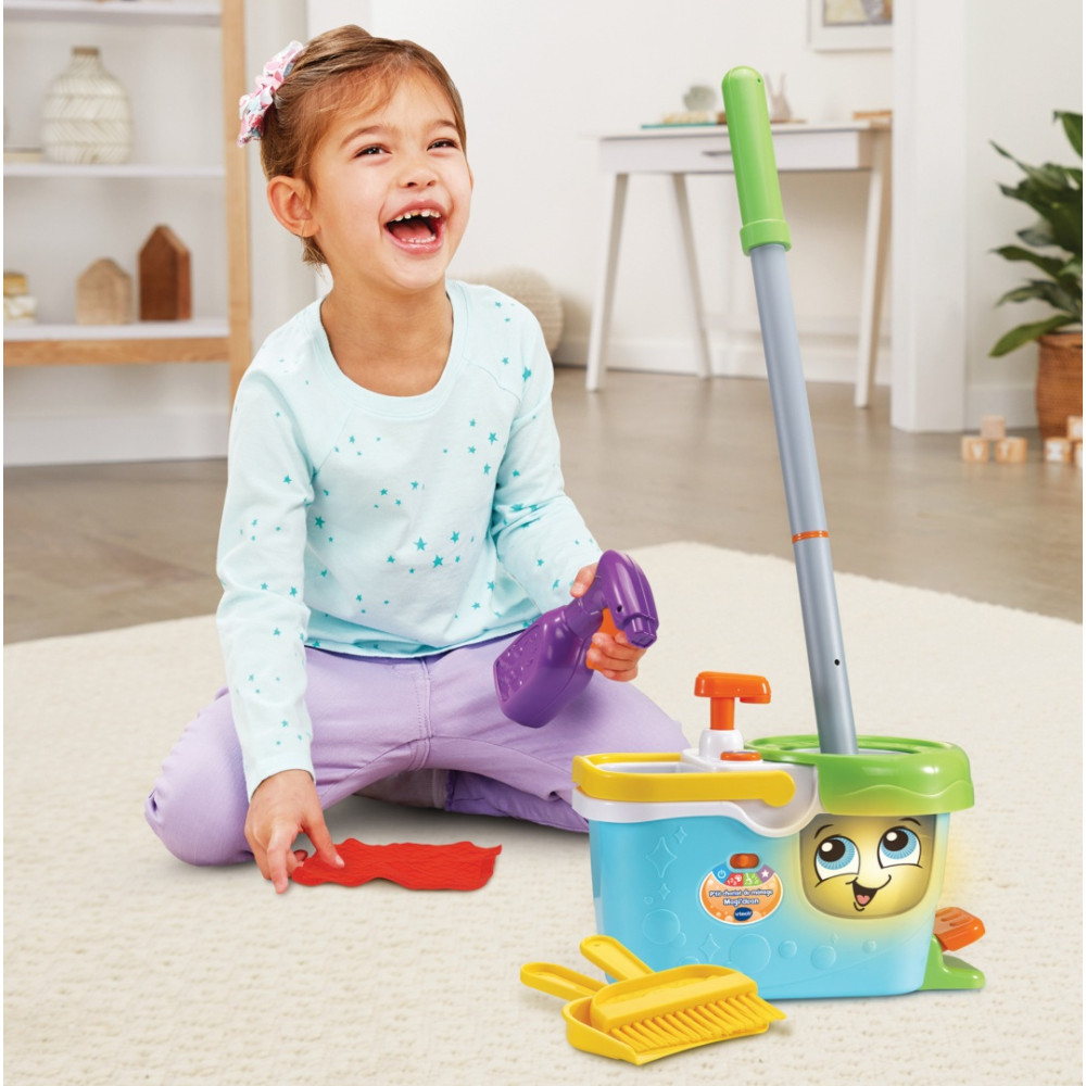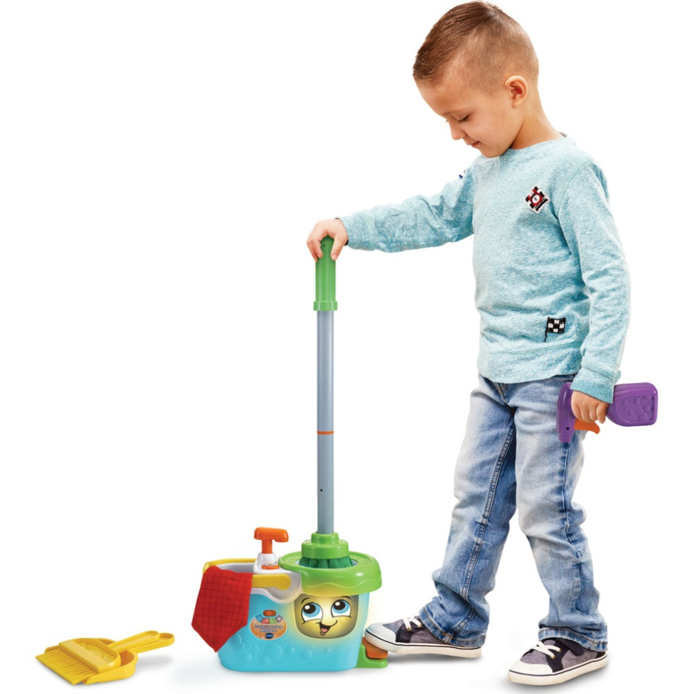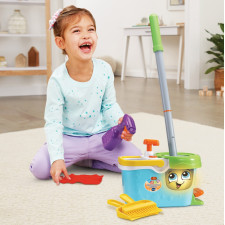 P'tit chariot de ménage Magi'clean - Un chariot musical plein d’accessoires pour nettoyer la maison du sol au plafond ! En appuyant sur la pédale, l’enfant déclenche des effets sonores (bruits d’eau, airs de musique, phrases rigolotes) et enclenche un mécanisme d’essorage du balai. Il apprend également à compter. Le visage du seau s’illumine lorsqu’il parle, ou en mode essorage. Le distributeur de savon apprend à l’enfant à compter. Tous les accessoires peuvent être rangés dans le chariot. 3 modes de jeu : couleurs et dénombrement, musique et ménage, à ton tour ! Contenu : un chariot de ménage électronique, une serpillière, une pelle et une balayette, un flacon pulvérisateur et un chiffon. Arrêt automatique.