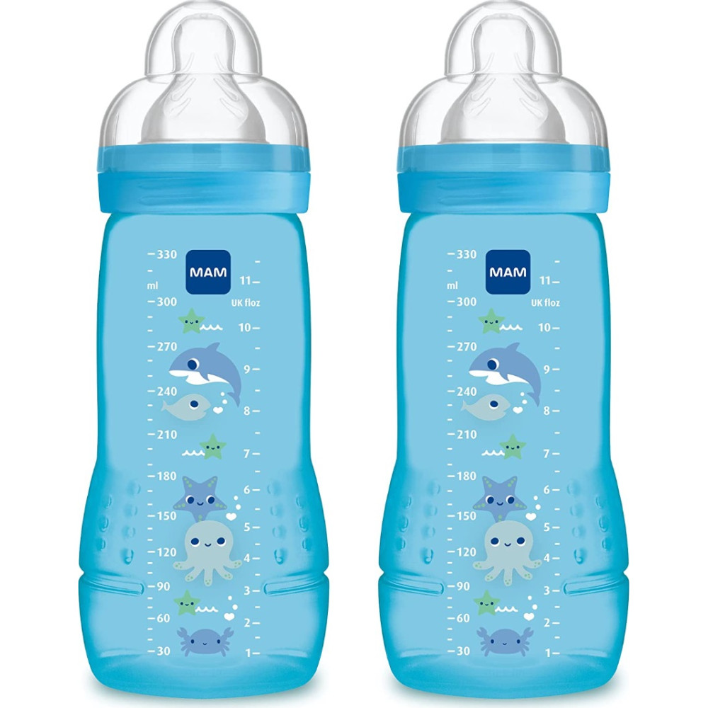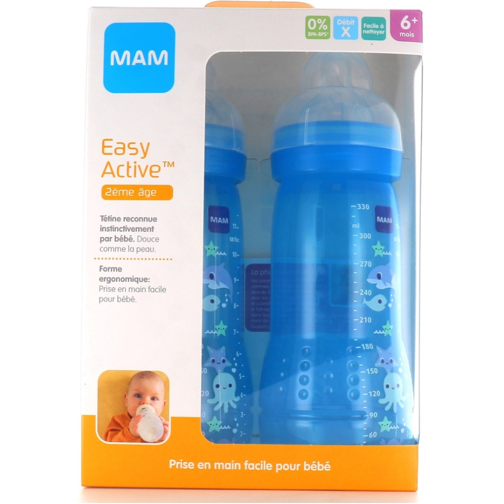 Biberon en silicone forme ergonomique - Nourrisson de + 6 mois - Modèle : EASY ACTIVE avec 1 tétine Débit X - Capacité : 330 ml - Couleur : BLEU - Lot de 2 unités - Tétine en silicone, plate, douce comme la peau - Elle est reconnue instinctivement par bébé.