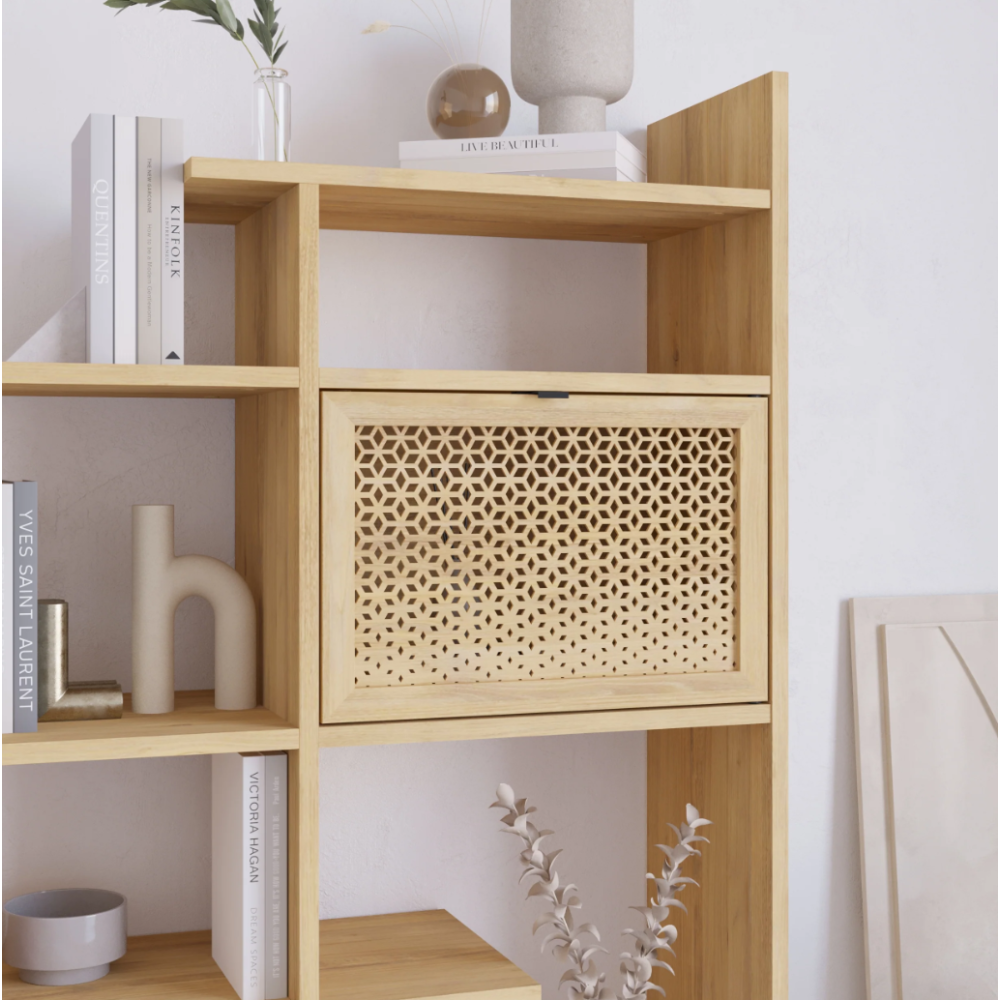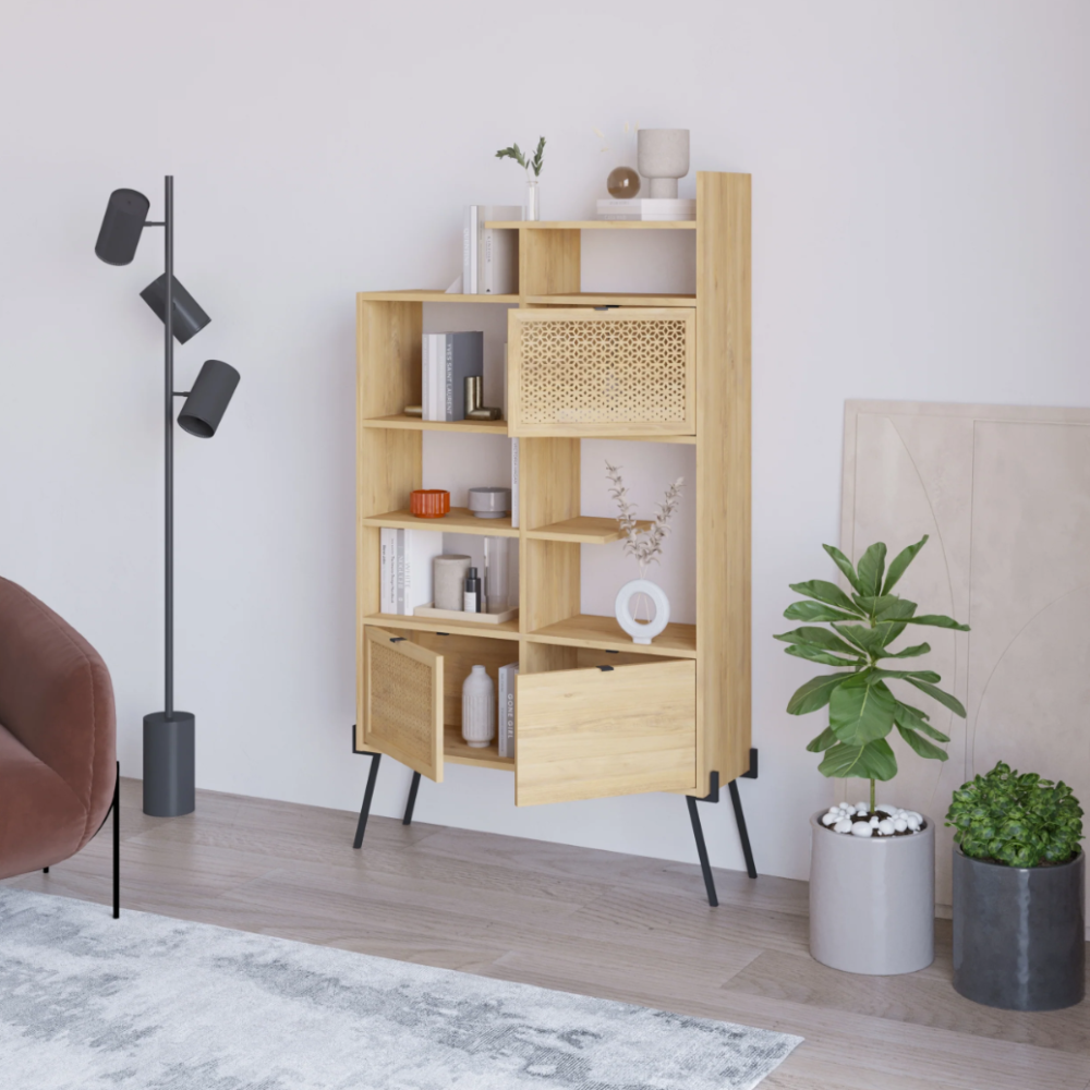 Bibliothèque écrin fabriquée en bois de chêne clair - Soutenue par 4 pieds en métal de couleur noire - Comporte 3 portes et 4 étagères soigneusement agencées - Idéale pour le rangement de livres, boîtes, vases et autres effets - Propose des cavités de rangement ouvertes et fermées selon les besoins.