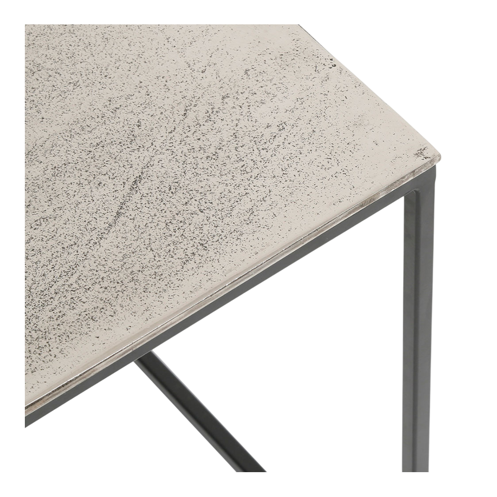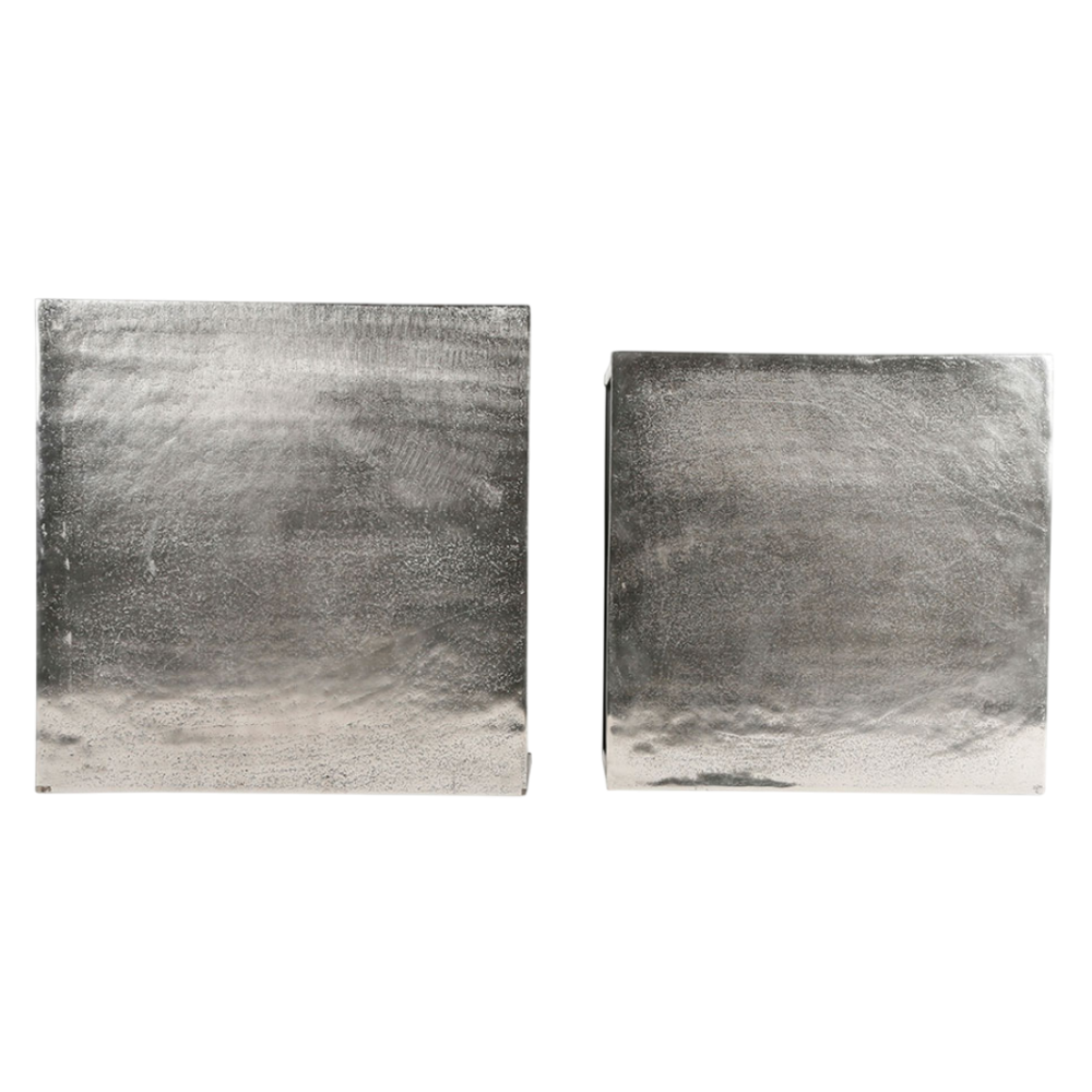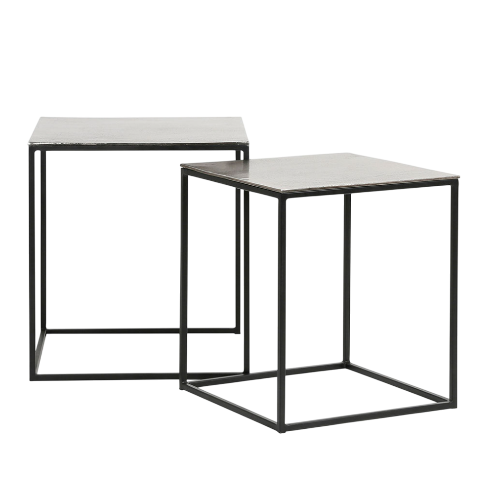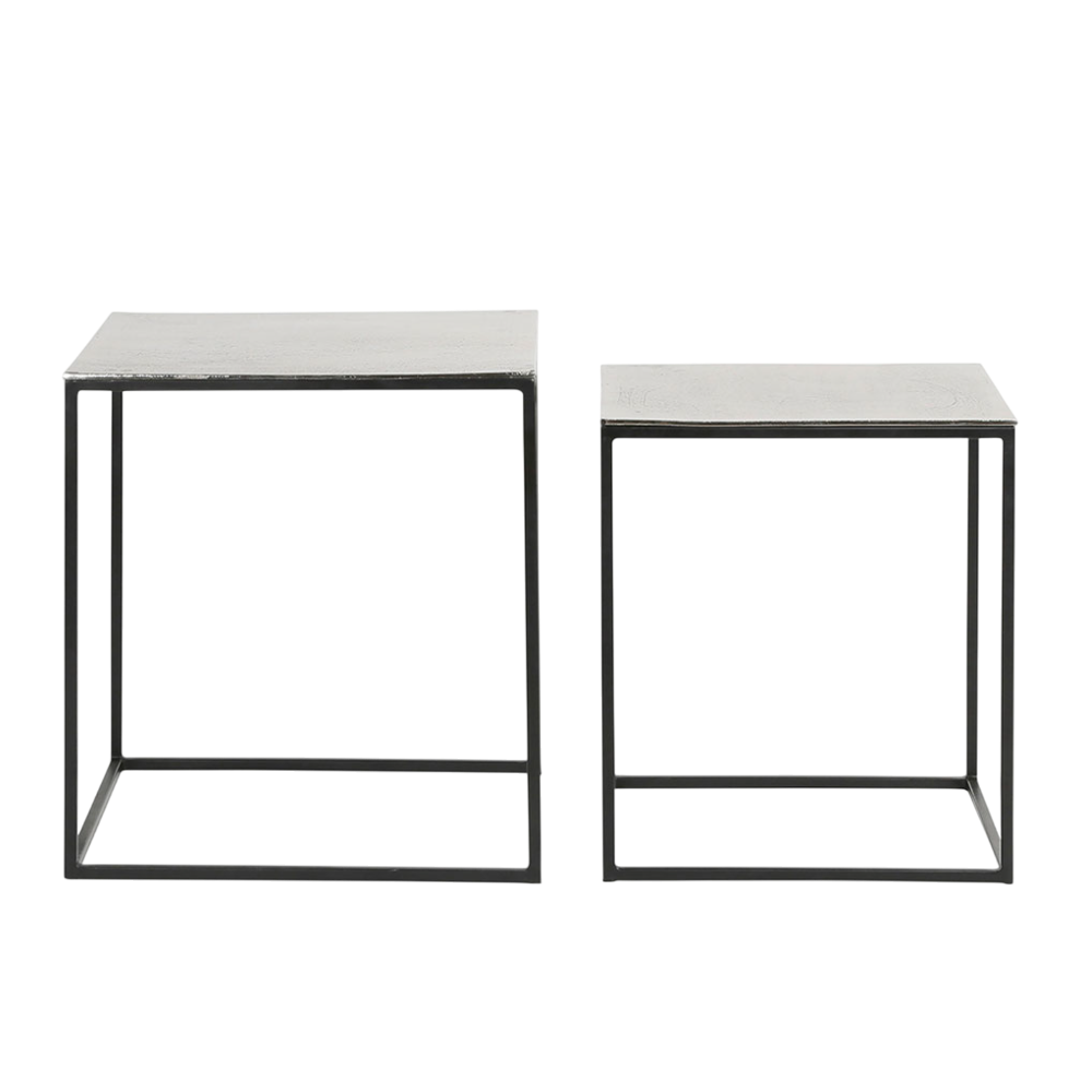 Équipez votre salon de la table basse gigogne carrée en aluminium et fer argenté, parfaite pour un intérieur classique chic ou contemporain. Cette table basse en métal argenté, au design carré épuré, apporte une touche de raffinement et de modernité à votre salon, votre bureau ou tout autre espace de vie. Le plateau en aluminium martelé, sublimé par une finition argentée, réfléchit subtilement la lumière, créant ainsi une atmosphère à la fois chic et sophistiquée. Ce duo de tables gigognes carrées est idéal pour optimiser l'espace, tout en offrant une grande flexibilité d'utilisation. Vous pouvez les disposer ensemble pour un effet de superposition élégant ou les séparer pour une organisation plus fonctionnelle. Leur design intemporel et la combinaison du métal argenté avec des pieds en fer noir en font un meuble adapté aux intérieurs au style moderne ou classique. Utilisée en table basse principale, en bout de canapé, ou comme support d'appoint près d'un fauteuil, la table basse gigognes harmonise parfaitement avec différents design de canapés et fauteuils. Dimensions: 45 x 45 x H50 et 40 x 40 x H46cm.