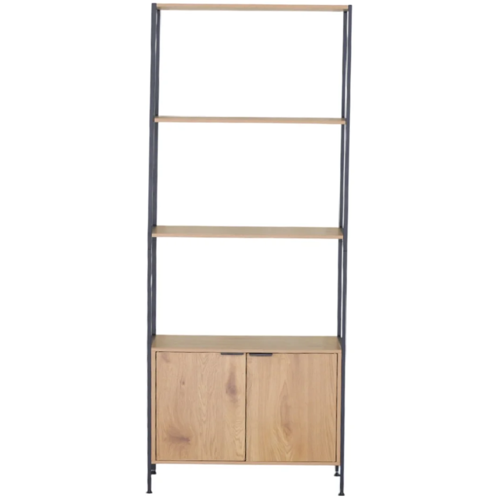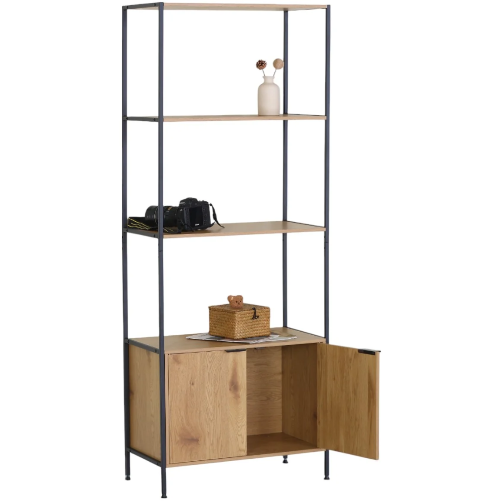 Bibliothèque fabriquée avec une structure en panneaux de particules avec finition mélaminée - Embarque un espace de rangement bas fermé par deux portes avec poignées intégrées - Le meuble fait 176 cm de haut, 35 cm de profondeur et 68 cm de large - Propose un design mixte avec des supports en métal noir et des étagères en effet bois - Dispose de 3 étagères à exploiter à souhait pour le rangement d’accessoires divers - Repose sur des pieds métalliques qui assurent sa stabilité permanente.