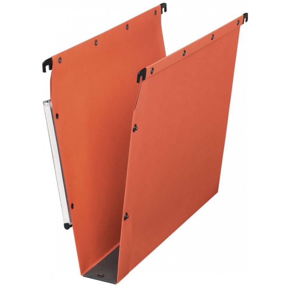 En kraft orange 220 g/m². Mise en continu universelle par bouton-pression plastique ou par volet d'agrafage. Porte-étiquette effet loupe. Entraxe standard de 330 mm. Boîte de 25 unités.
