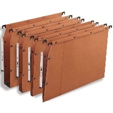 Dossiers suspendus pour armoire DAFI FLEX - FOND 15 MM - BOITE DE 25 - A4 - KRAFT OR, fond 15 mm - Pour format A4 (27 x 32 cm). En carton kraft orange de 220 g/m². Porte-étiquette de 130 mm sur le côté du dossier. Mise en continu par volet d'agrafage. Entraxe: 330mm.