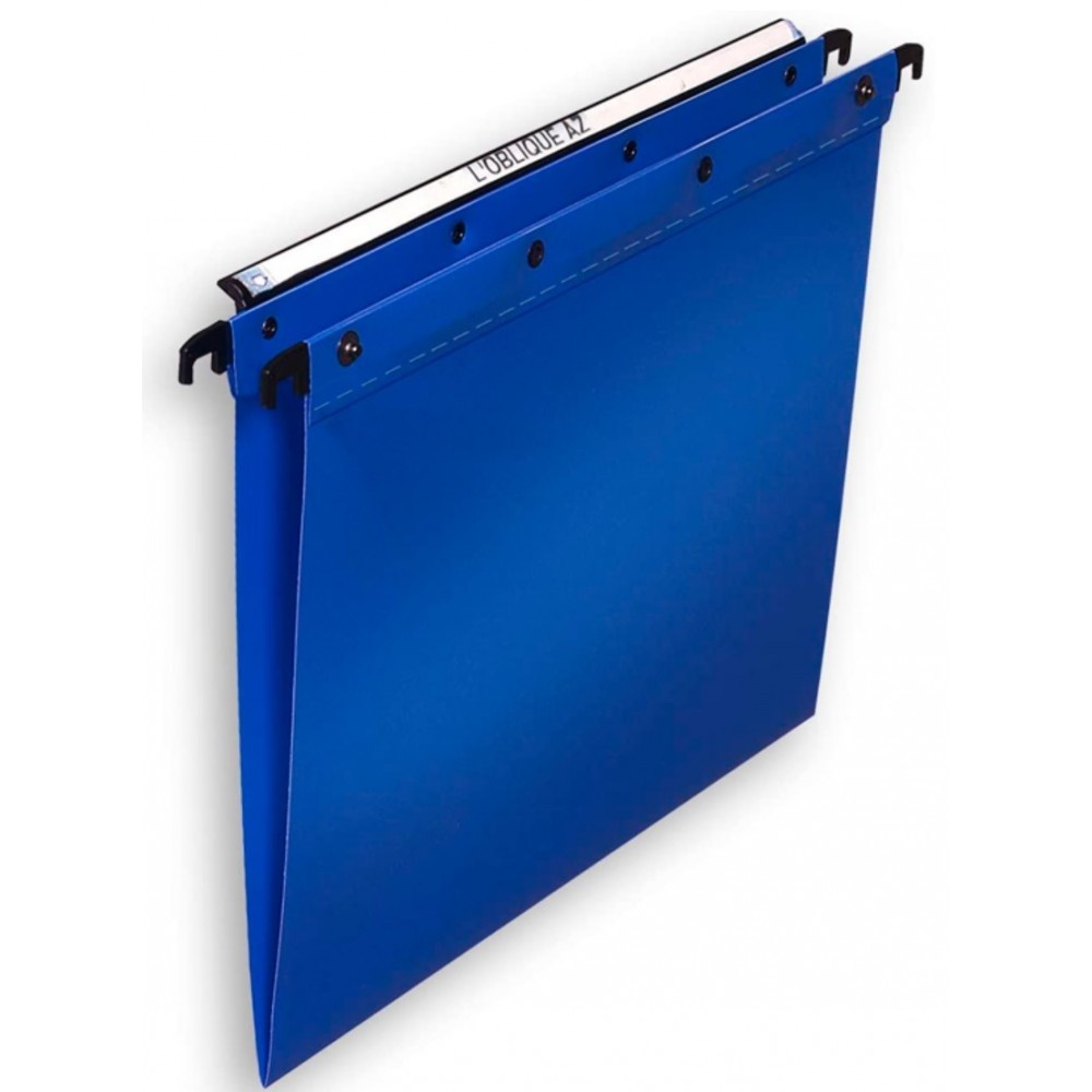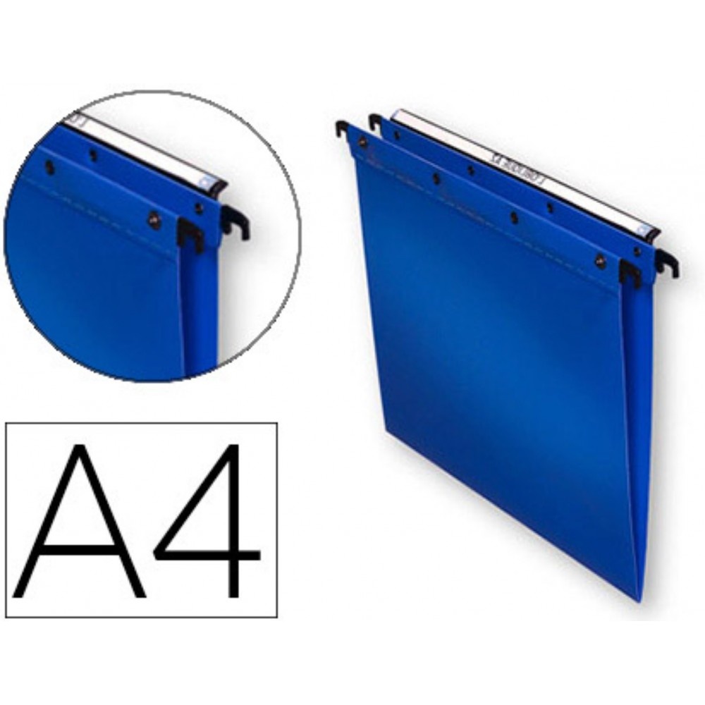 Dossiers suspendus indéchirables, indéformables et imperméables. Largeur du fond : 30mm. Pour documents de format A4. Modèle : Polypro V Ultimate. Matière : Polypropylène épaisseur 5/10ème. Dos renforcé par une bande de polypropylène d'épaisseur 5/10ème pour une résistance maximale à la charge. Couleur : Bleu. Fond strié pour éviter le glissement des documents à l'intérieur du dossier suspendu. Avec porte-étiquette extra-large effet loupe sur le côté. Barre de suspension métallique. système d'assemblage anti-déchirure (polypropylène riveté et finition soudure). Possibilité d'assembler les dossiers grâce au bouton pression en métal. Conditionnement : Lot de 10 dossiers suspendus.