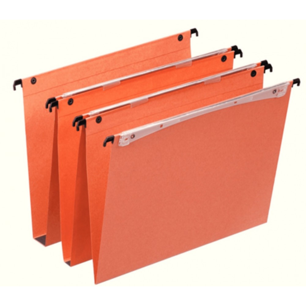 Dossiers suspendus pour armoire DAFI FLEX - FOND 15 MM - BOITE DE 25 - A4 - KRAFT OR, fond 15 mm - Pour format A4 (27 x 32 cm). En carton kraft orange de 220 g/m². Porte-étiquette de 130 mm sur le côté du dossier. Mise en continu par volet d'agrafage. Entraxe: 330mm.