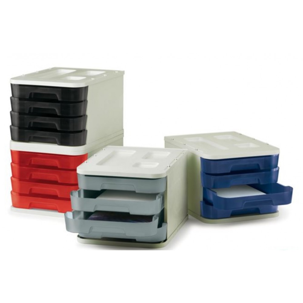 Modules de 4 tiroirs en polystyrène 100% recyclables. Système de verrouillage qui empêche le tiroir de sortir. Conçu pour s’empiler verticalement en formant un seul bloc. Extérieur gris et tiroirs de couleur noire. Dimensions : 285x375x230 mm.